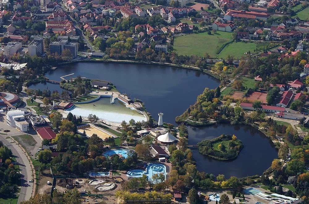 – открытую территорию площадью 30 гектаров, где есть и средиземноморский берег с песчаным пляжем, пиратским кораблём, пальмами и маяком, и 13 бассейнов, и водные горки, и игровые площадки; здесь можно покататься на водном велосипеде, на лодке, поиграть в пляжный воллейбол, настольный теннис, в пляжный футбол и даже в шахматы; в барах и ресторанах на территории пляжа можно попробовать не только шедевры венгерской кулинарии, но и блюда других стран;