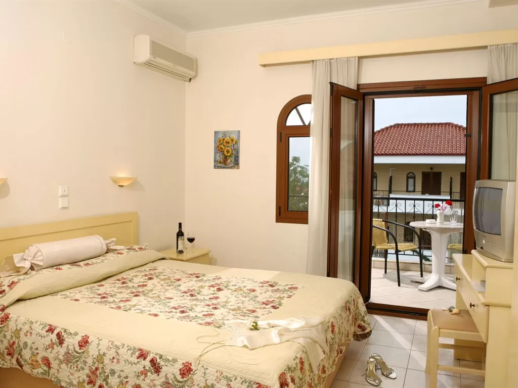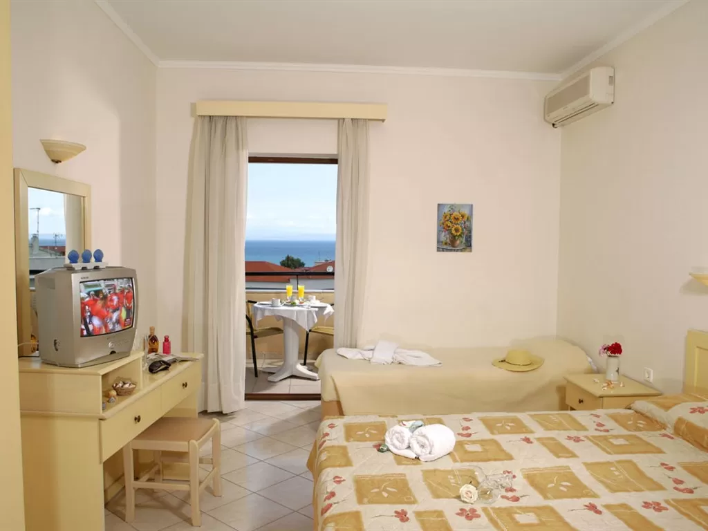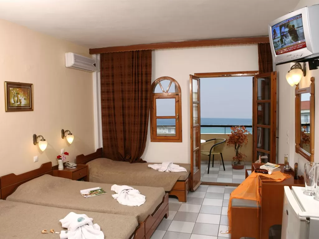 Всего 77 номеров: Economy Doubles (~16 кв.м), Economy Triples (~25 кв.м), Singles (~10-12 кв.м), Doubles Standard (~16 кв.м), Doubles Pool View or Sea View (~16 кв.м), Triples (~25 кв.м). В номерах: кондиционер с инд .пультом, спутниковое телевидение (рос. канал), телефон, мини-холодильник, душ, сейф (за доплату), фен, балкон/терраса. Economy Rooms Цокольный этаж, 15 ступенек ниже уровня земли, но в номерах есть балкон. Doubles Pool View or Sea View Номера с видом на бассейн располагаются на втором и третьем этажах. Номера с видом на море - на третьем этаже. Тип дополнительной кровати - раскладная. Смена белья – 2 раза в неделю, ежедневная уборка номеров.