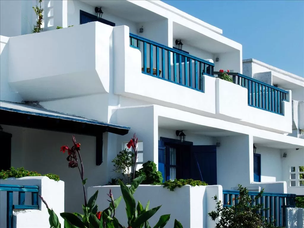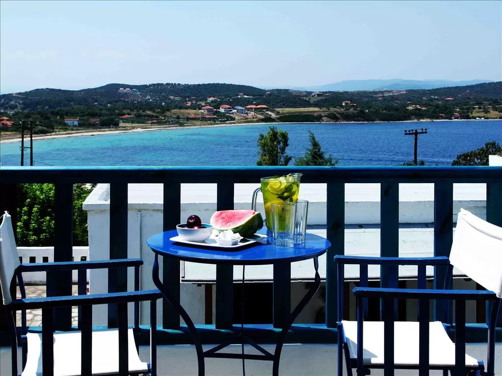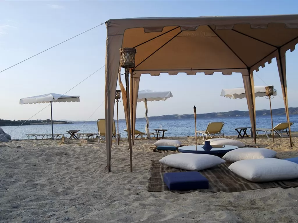 Песчаный пляж (3 пляжа, отмеченных Голубым флагом ЕС. Glarotopos – каменистый пляж с деревянными беседками, в которых проводятся процедуры Spa. Porto Agio – в 50 м от отеля, песчаный. Golden Beach – песчаный пляж в 5 мин. ходьбы от отеля), пляжные полотенца под залог, лежаки и зонты - бесплатно