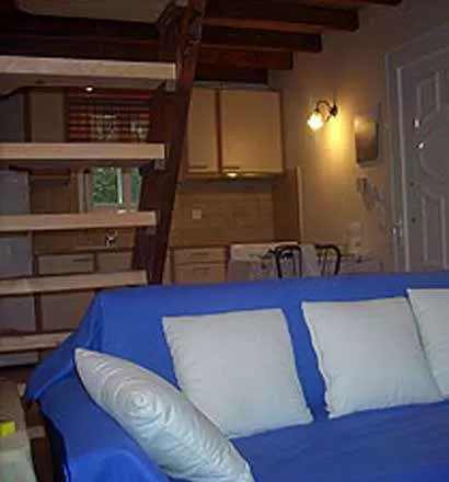 Apartment Erato Стиль мезонеты. На первом этаже – салон с кухней, двуспальная или 2 односпальные кровати, ванная комната, 1 кондиционер, на втором этаже – двуспальный диван-кровать.