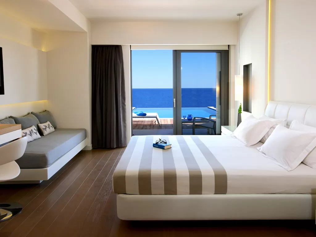 Всего 49 номеров: Сlassic Rooms Olympus View/Sea View (~28-32 кв.м), Family Rooms Intercon OV/SV (~55 кв.м), Junior Suites Private Pool/SV (~35 кв.м), Suites Executive Private Pool /SV (~60 кв.м).