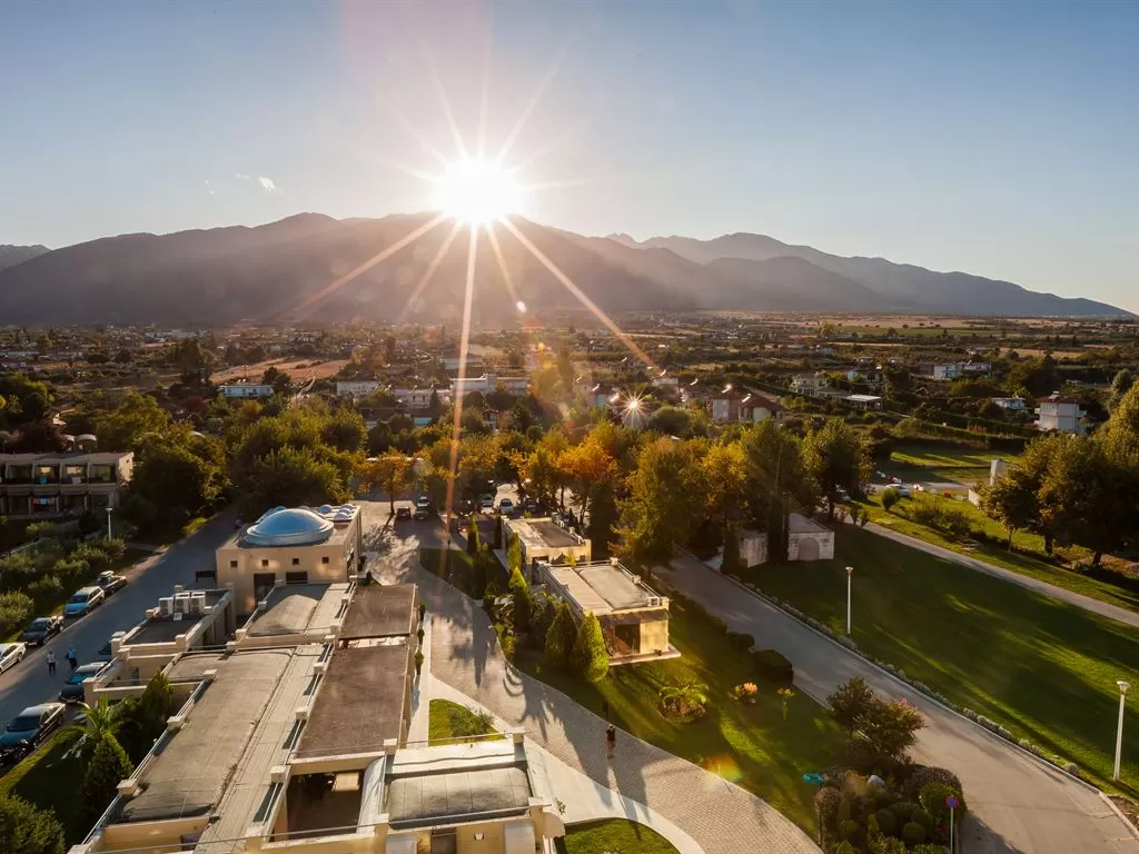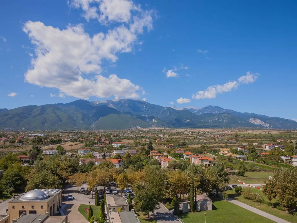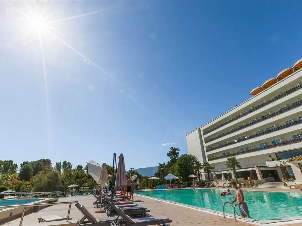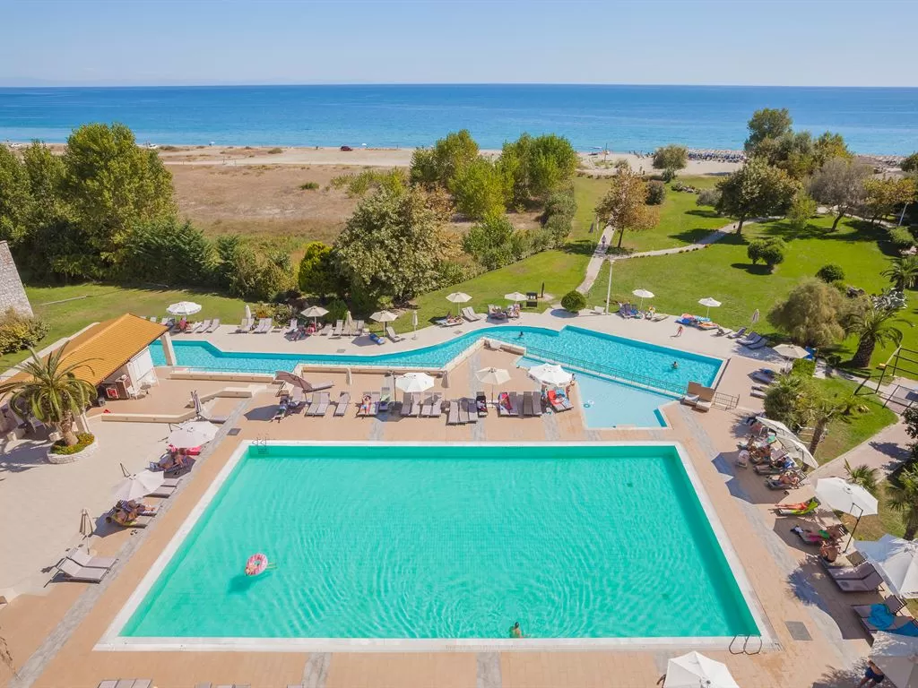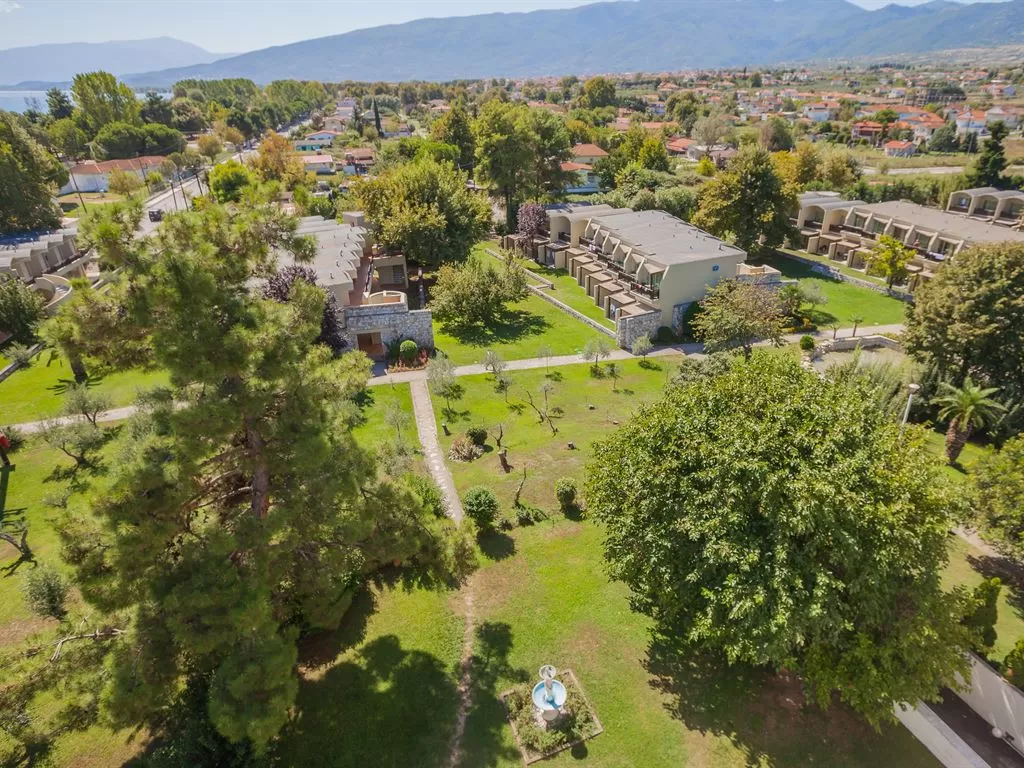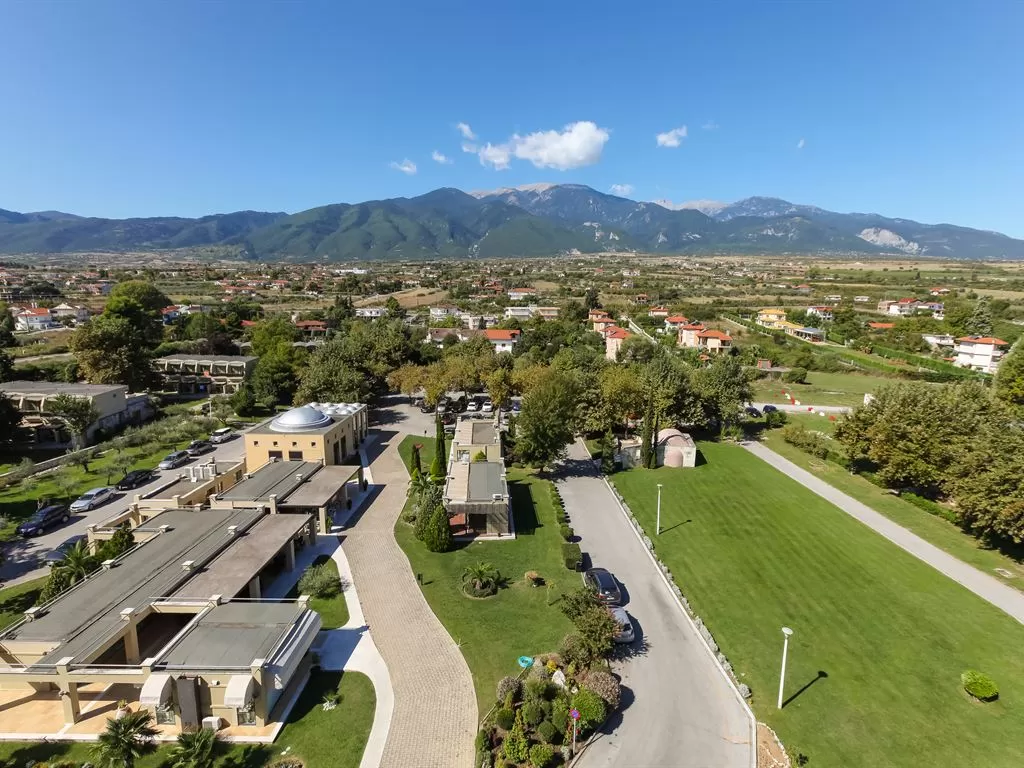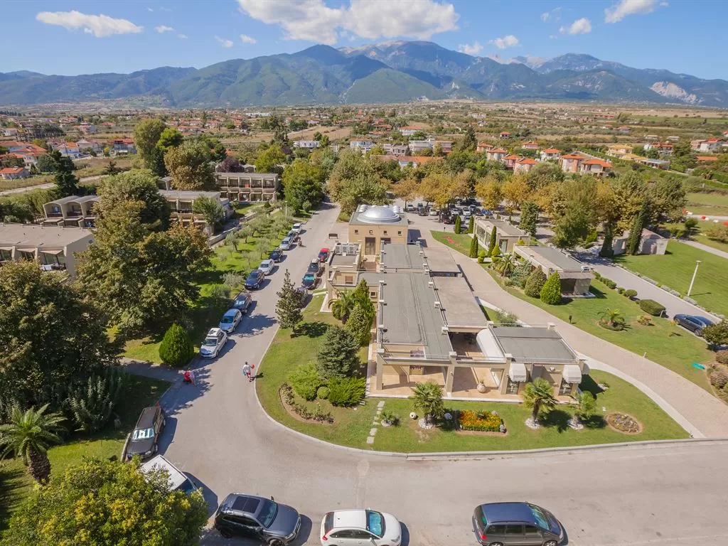 В 1 км от пос. Лептокарья, в 8 км от п. Литохоро, в 15 км от Диона, в 22 км от горы Олимп, в 26 км от г. Катерини, 30 км от Паралии Катерини, 120 км от аэропорта «Македония» и в 110 от г. Салоники. Состоит из центрального пятиэтажного здания и двухэтажных бунгало. В курортном поселке Лептокарья множество магазинов, ресторанов, баров, парк.