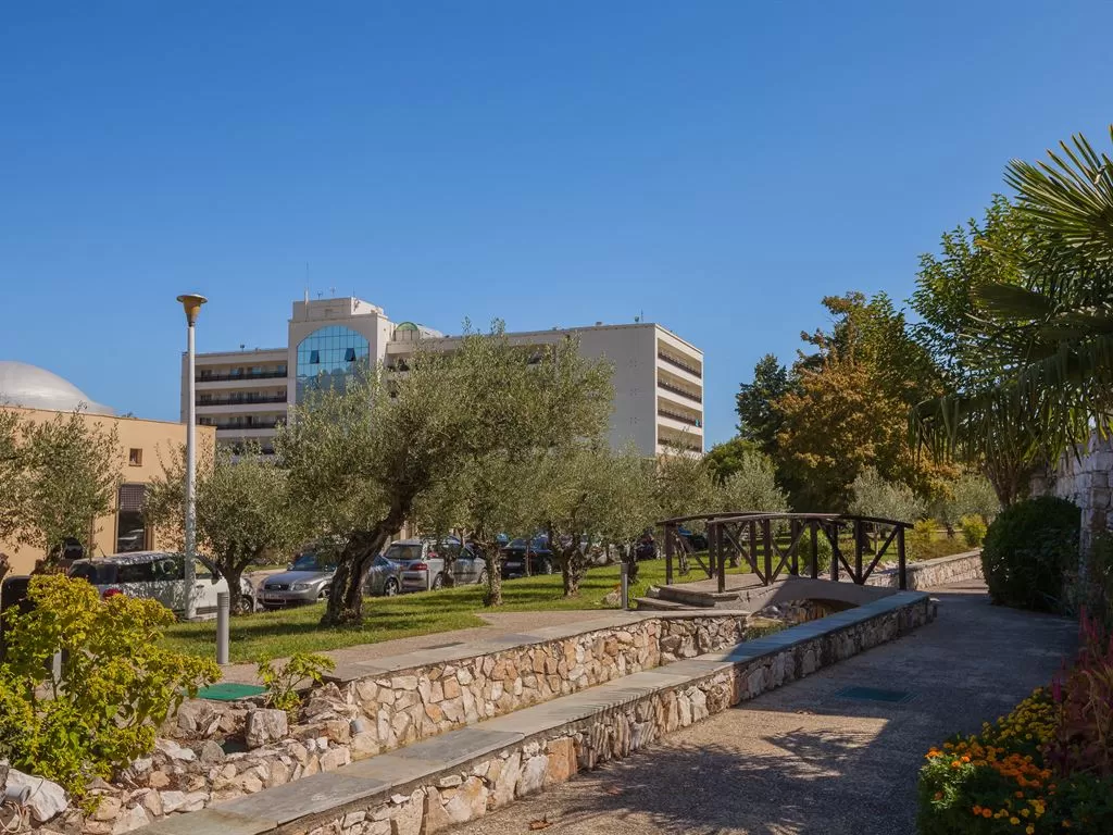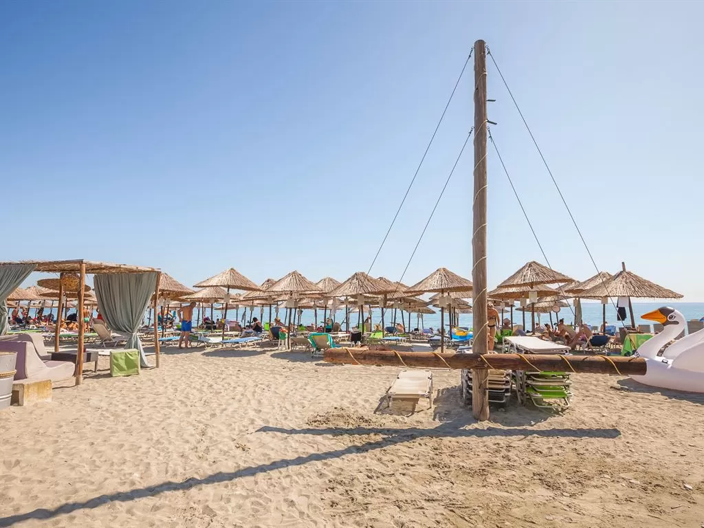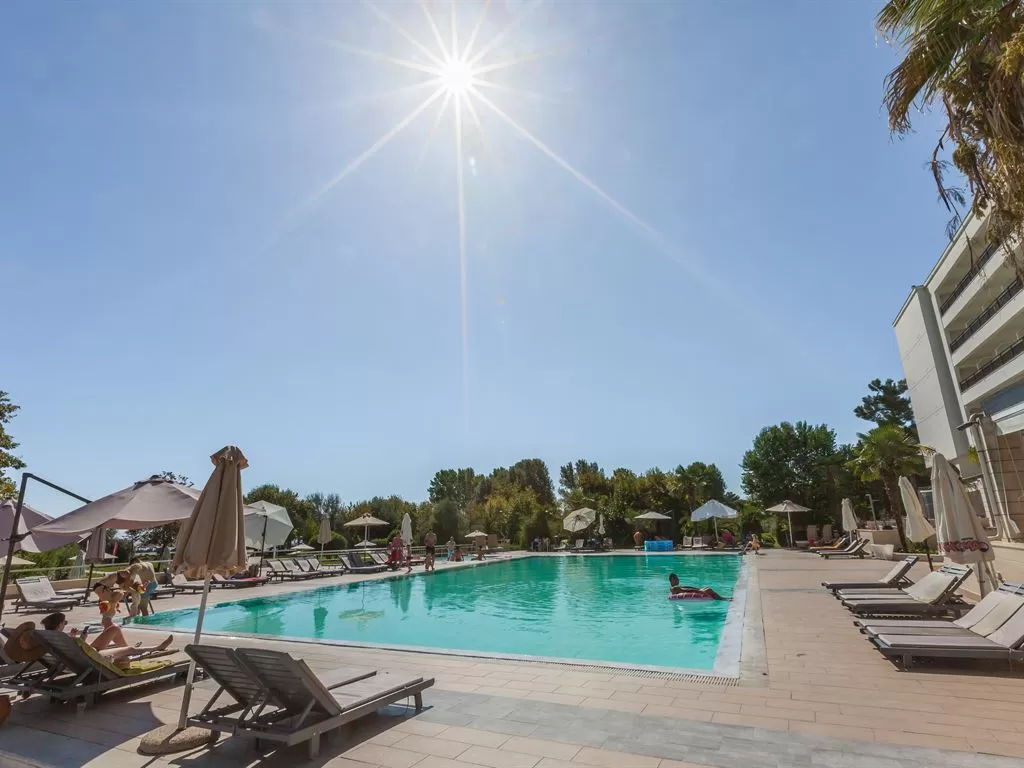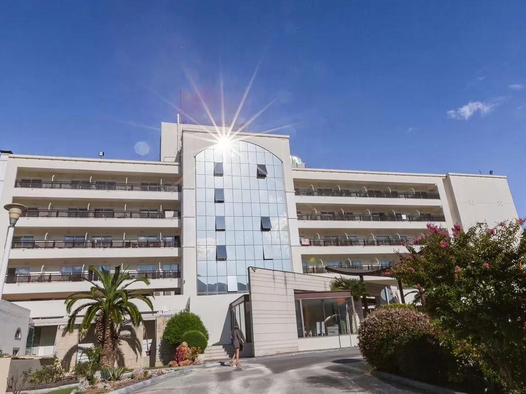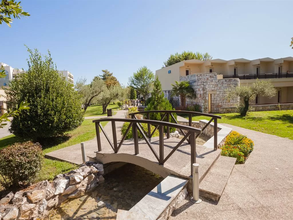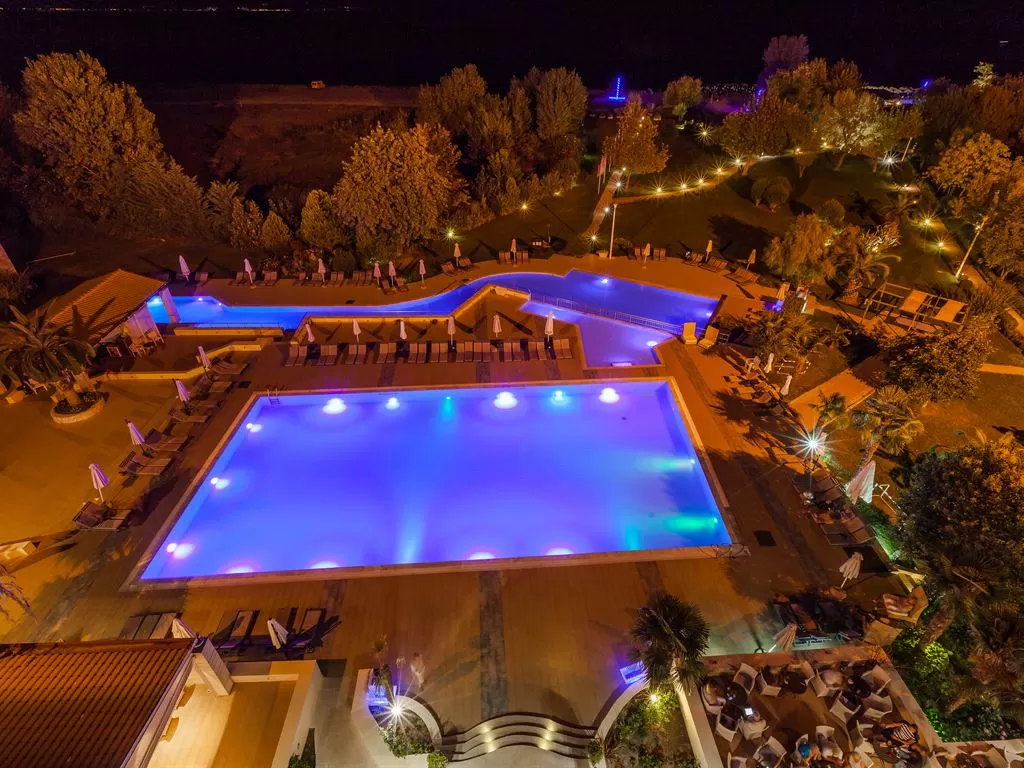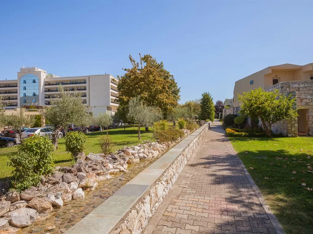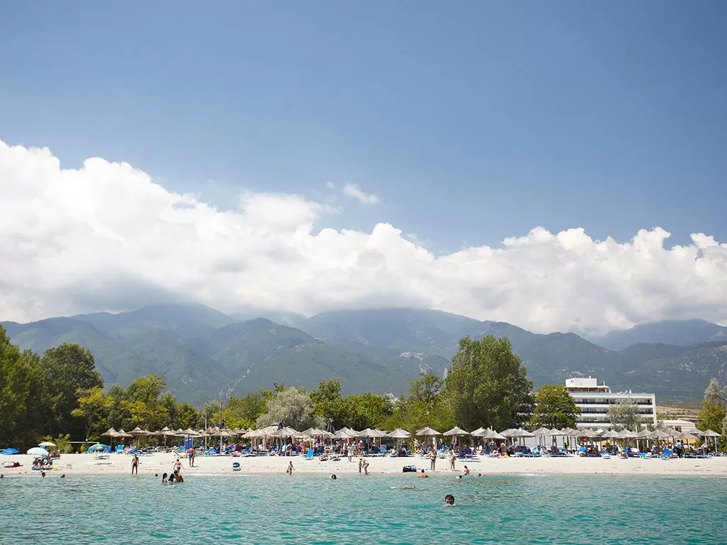 В 1 км от пос. Лептокарья, в 8 км от п. Литохоро, в 15 км от Диона, в 22 км от горы Олимп, в 26 км от г. Катерини, 30 км от Паралии Катерини, 120 км от аэропорта «Македония» и в 110 от г. Салоники. Состоит из центрального пятиэтажного здания и двухэтажных бунгало. В курортном поселке Лептокарья множество магазинов, ресторанов, баров, парк.