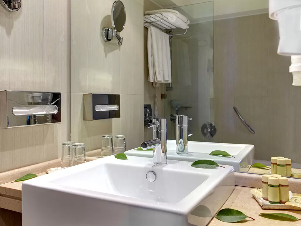 Double Rooms Olympus View or Sea View Расположены в центральном здании, 2 односпальные кровати. Номера в центральном здании имеют стеклянную дверь между ванной комнатой и спальней. Дополнительная кровать для 3-го человека – раскладная.