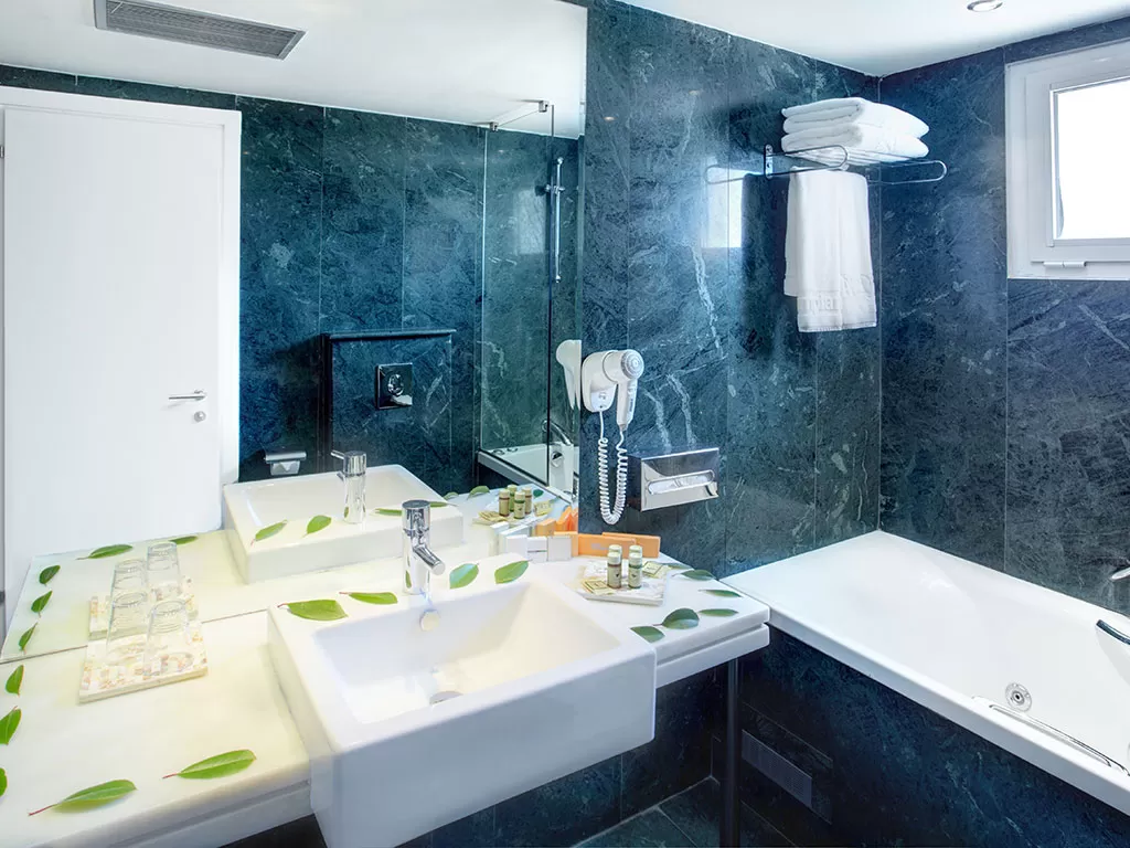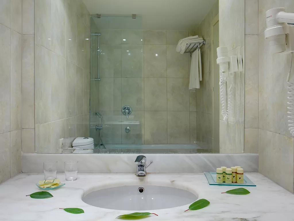 Suite Sea View or Olympus View Расположены в центральном здании. Гостиный уголок с диваном и спальня открытой планировки с двуспальной кроватью, отделены стенкой, но нет двери, халаты и тапочки. Мраморная ванная комната, джакузи и душ с гидромассажем (в некоторых сюитах).