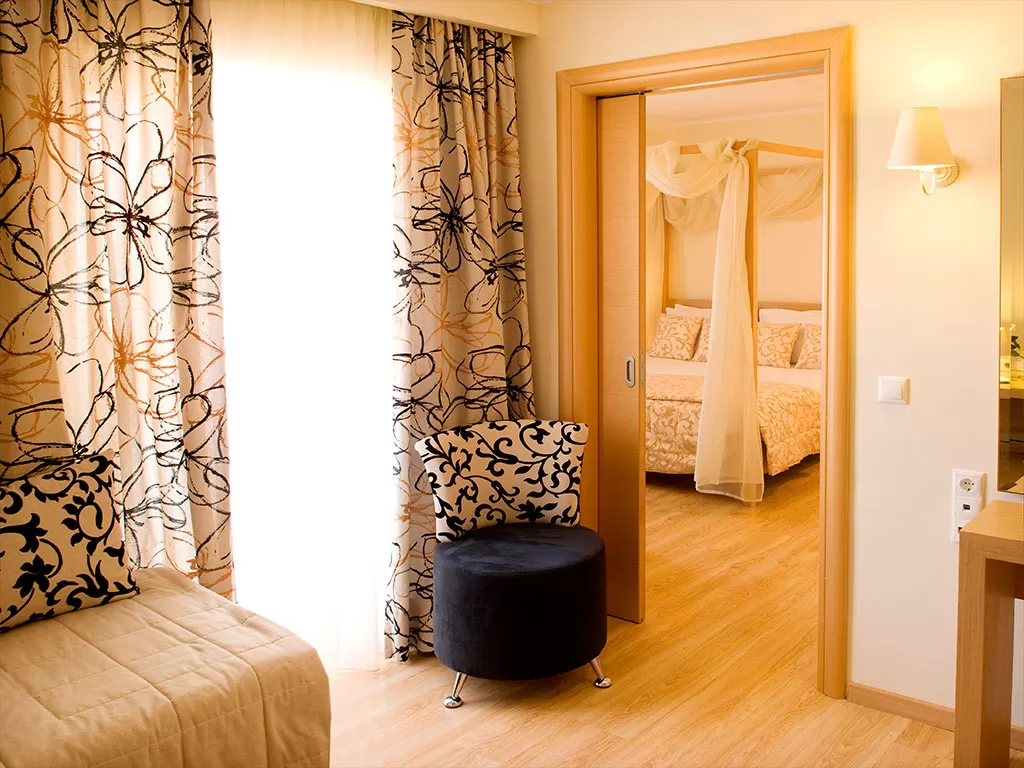 Suite Superior (~45-50 кв.м) Элегантный стиль. Главная спальня с двуспальной кроватью королевских размеров, отдельная гостиная зона (с 2-мя односпальными кроватями), ванна.