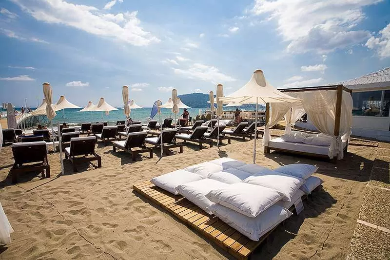 песчано-галечный пляж на территории общественного пляжа, пирс, длина пляжа - 200 м, вход в море - галька; зонты, шезлонги, матрасы – бесплатно, полотенца – платно. Между отелем и пляжем проходит дорога и променад, имеется подземный переход.