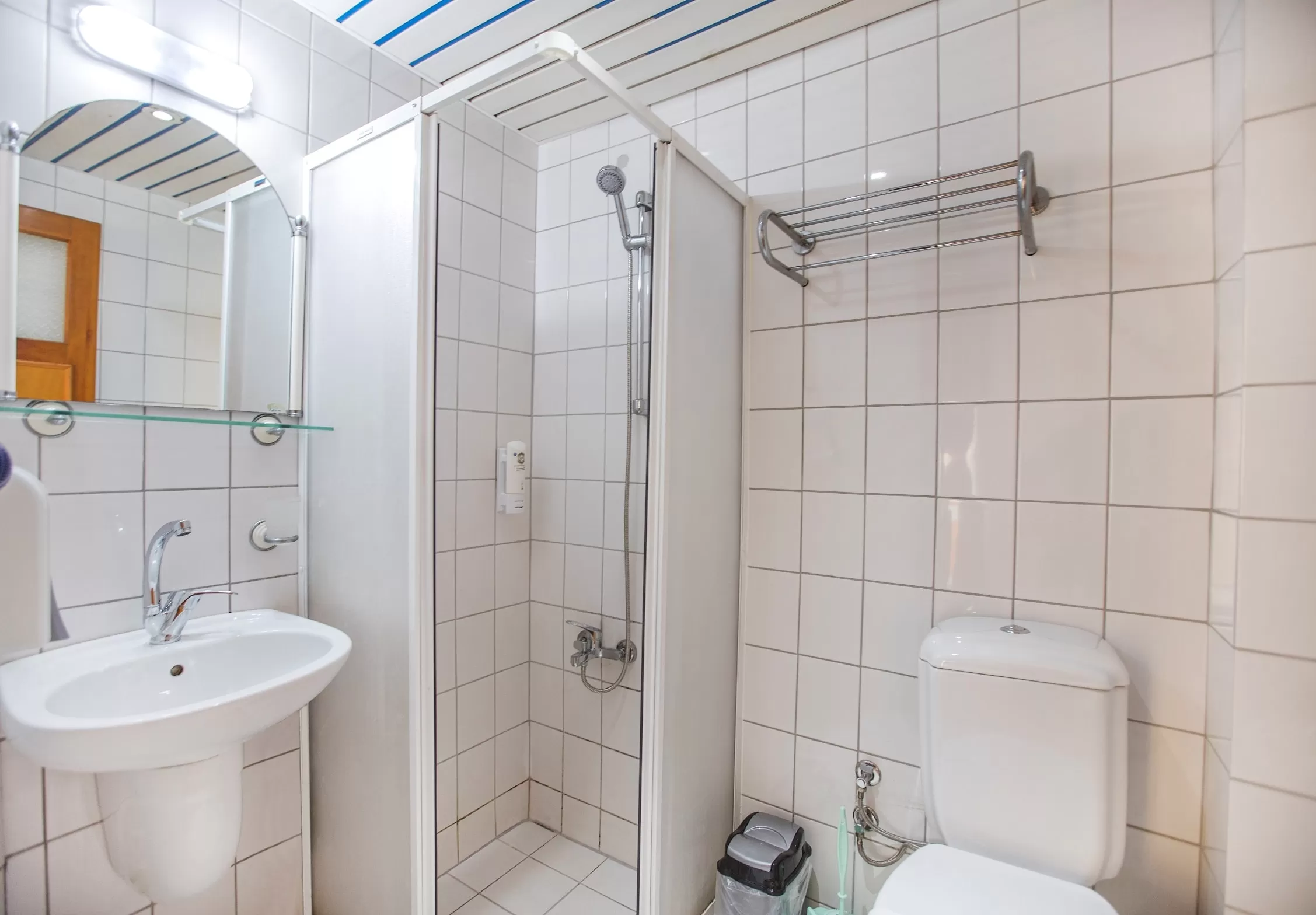 Фен в номере, индивидуальный кондиционер, пол –керамическая плитка, балкон, уборка номера - ежедневно, ТВ - спутниковое (есть русский канал), телефон, душевая кабина, смена белья-2 раза в неделю, сейф (платно).