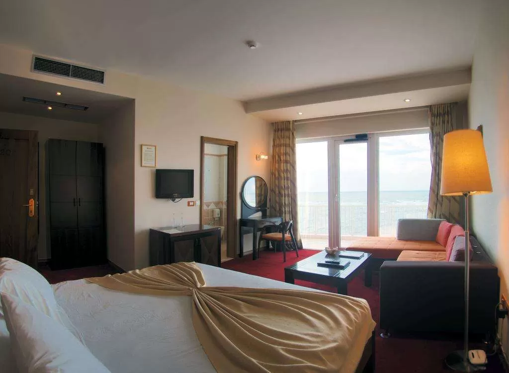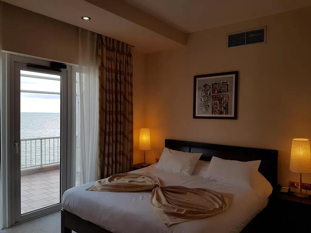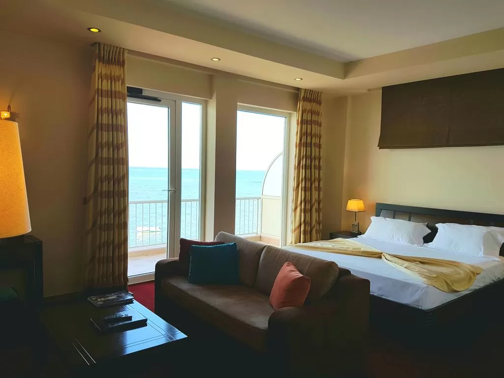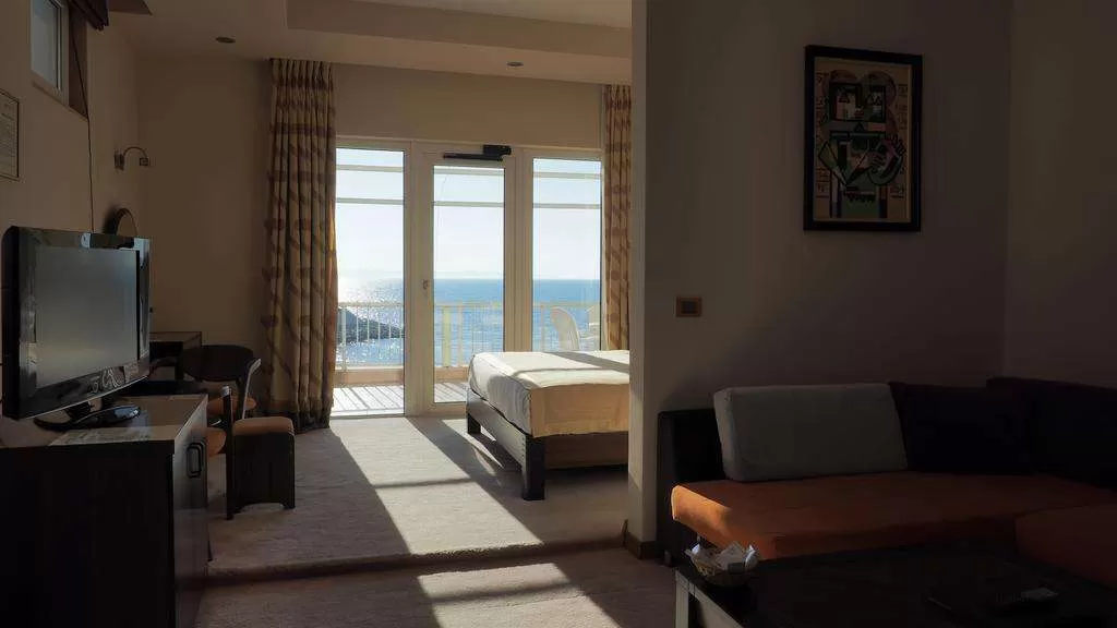 SUITE Sea View: Номер (около 50 м²) c балконом. Номер разделен на 2 зоны: зону спальни с двуспальной кроватью King size и зону гостиной с раскладным диваном, который может быть использован как спальное место. В номере имеется электрочайник. Максимальное количество человек: 3 взрослых. Общее количество номеров в отеле: 1.