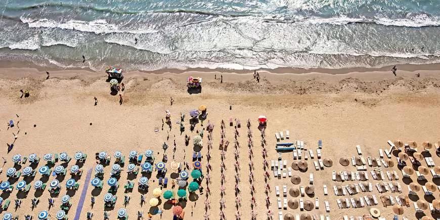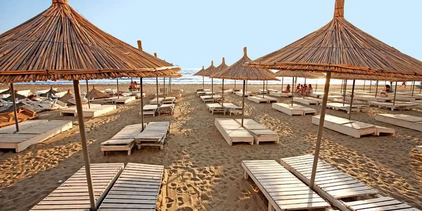 собственный, песчаный, первая береговая линия, 20 метров от отеля. Пляжные полотенца не предоставляются. Зонтики, лежаки входят в стоимость. Полотенца предоставляются под залог (около 2 euro)
