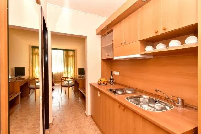 22 двухместных номеров с кухонным уголком - просторные, с прямым или боковым видом на море, комфортно обставленные. В номере две кровати, мини бар, телевизор, телефон, кондиционер, стол, тумбочки, маленький столик с табуретами, гардероб с встроенным сейфом, полка для багажа, диван и дополнительная кровать, ванная комната (с ванной или душем), феном, телефоном и туалетом. Балконы просторные со столиком и стульями. Кухонный уголок оборудован встроенным холодильником, духовкой, раковиной, вытяжкой и кухонными принадлежностями. Все номера с боковым видом на парк или море.