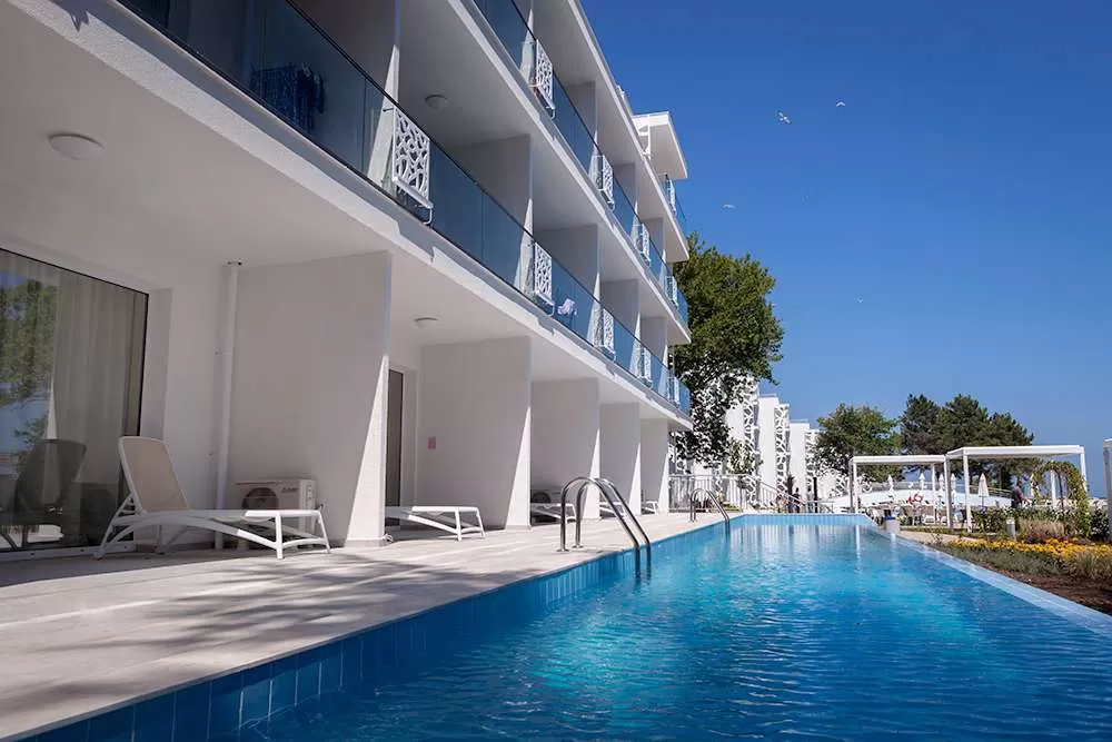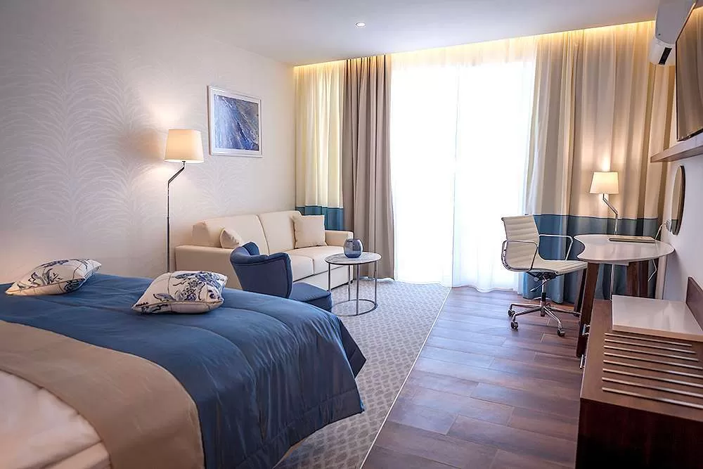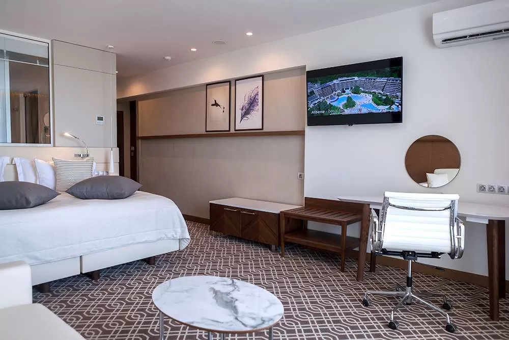 Номера делюкс и апартаменты: 233 номера и односпальных апартамента расположены в 9 этажном здании отеля, 11 из них имеют доступ к своему собственному бассейну, а остальные - с видом на море или с видом на парк. Элегантный дизайн номеров и исключительное внимание к деталям, позволит удовлетворить высокие ожидания гостей.