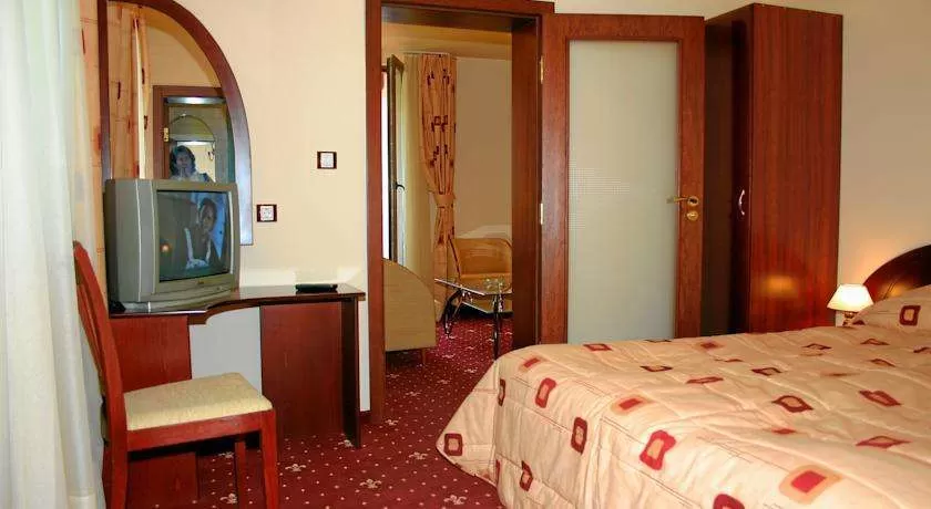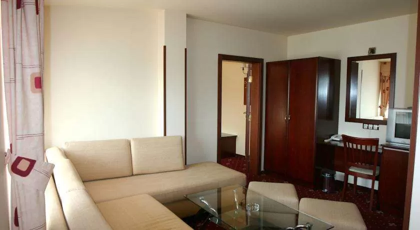 В апартаменте люкс: Более просторный, гостиная с камином, мягкой мебелью и спальня с одной двуспальной кроватью, самостоятельная спальня с двумя отдельными кроватями, спутниковое TV, телефон, интернет, мини-бар, санузел с душем, фен, махровый халат, балкон, санузел с душевой кабиной.