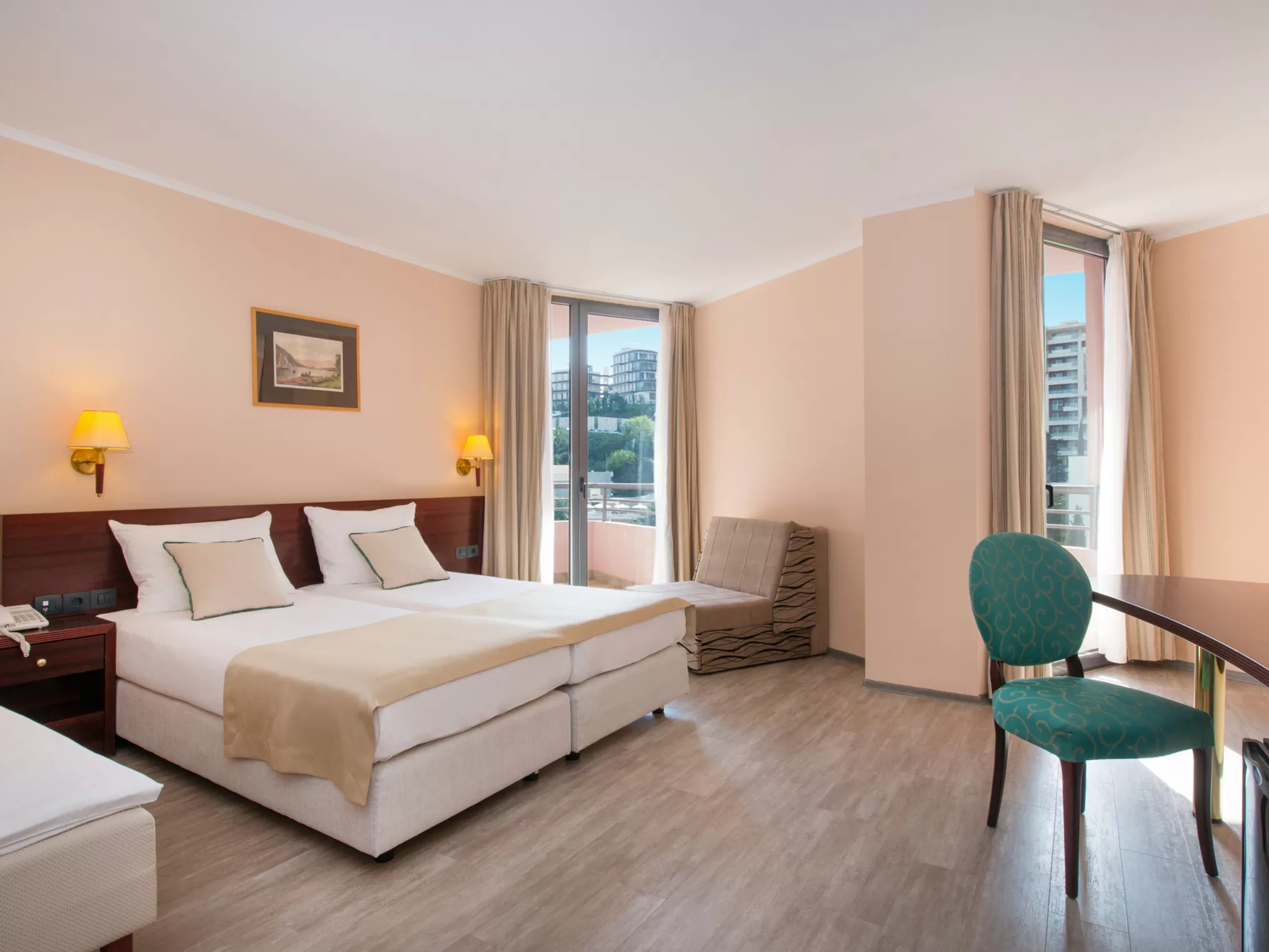Family room: 28-32м2, балкон или терраса, французская кровать или две отдельные кровати, 2 дополнительные раскладные кровати или дивана, ванная комната с душем. Максимальное размещение – 3 взрослых или 2 взрослых + 2 детей.