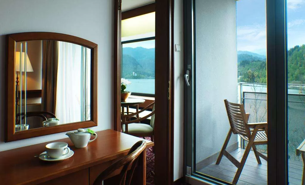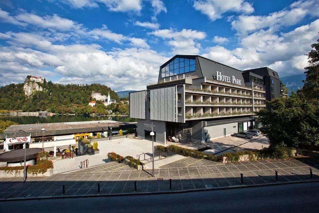 Расположен в самом центре курорта, на берегу озера Блед, откуда открывается великолепный вид на горы.