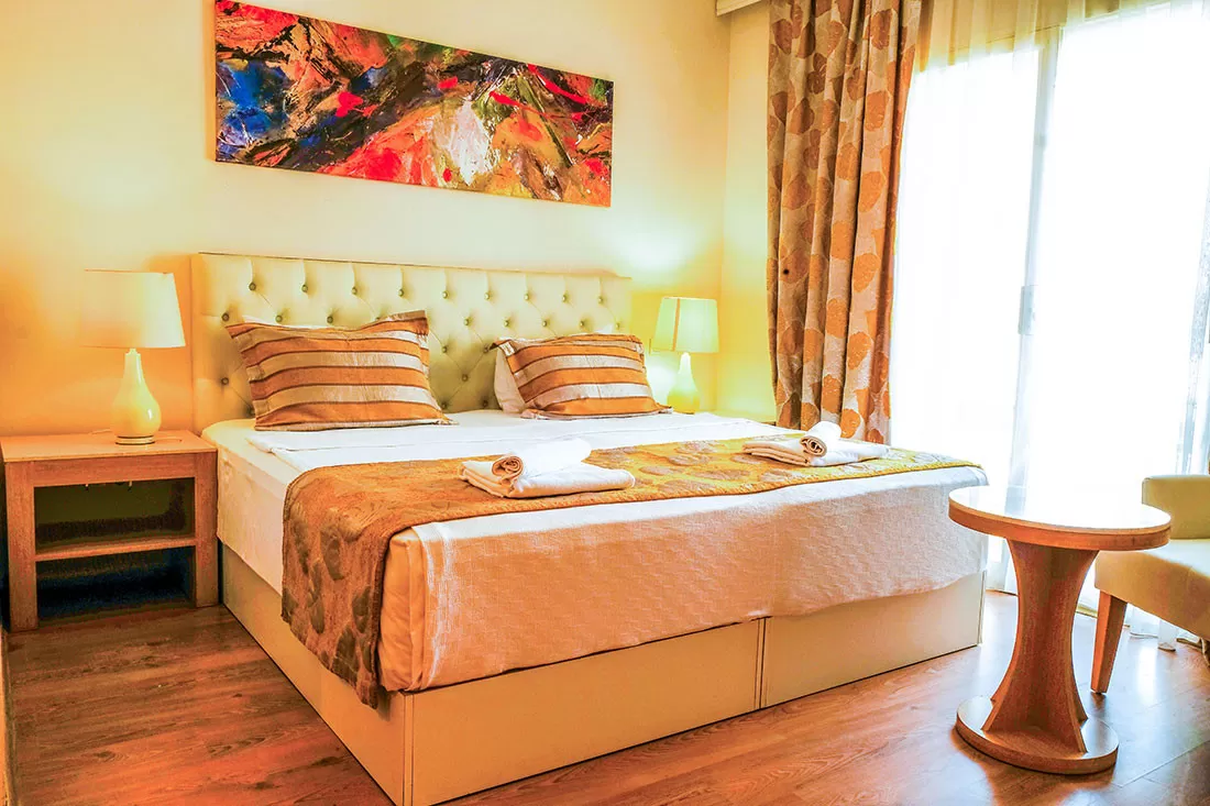 Всего 60 номеров: номера standard (18-22 кв. м, французский балкон, вид на сад/бассейн/на здания, максимум 2+1 чел.), номера junior suite (28-35 кв. м., однокомнатный номера, французский балкон, максимум 4 чел., номера king suite (200 кв. м., двухкомнатный номер, французский балкон, максимум 4+1 чел.). Отель не размещает гостей с ограниченными физическими возможностями.