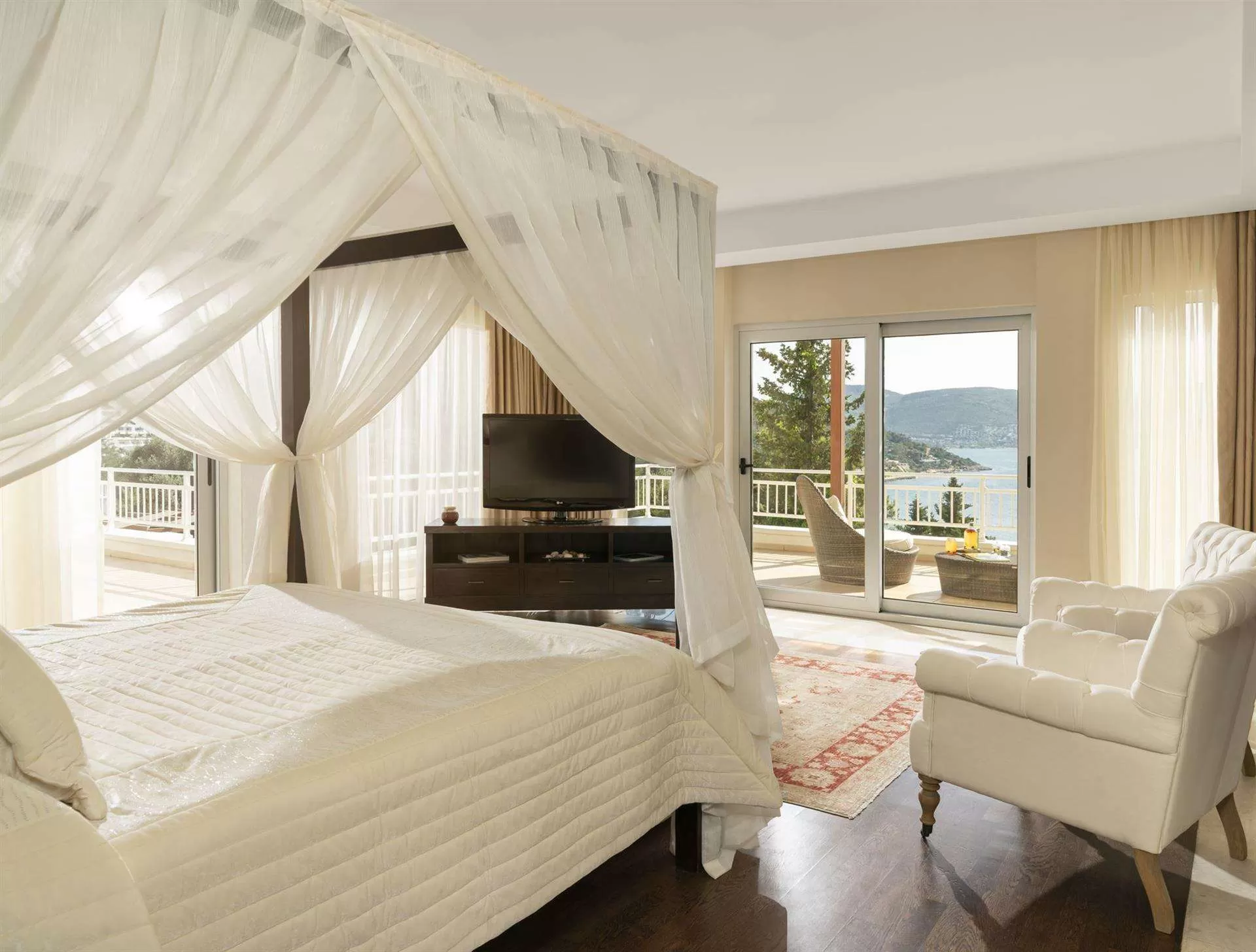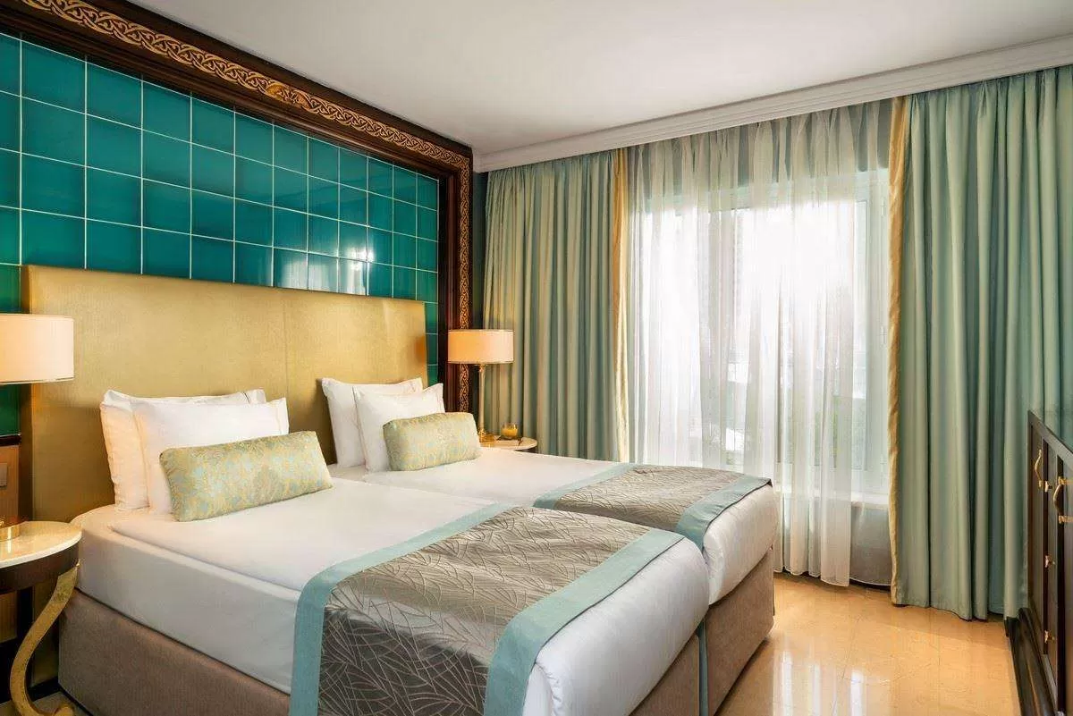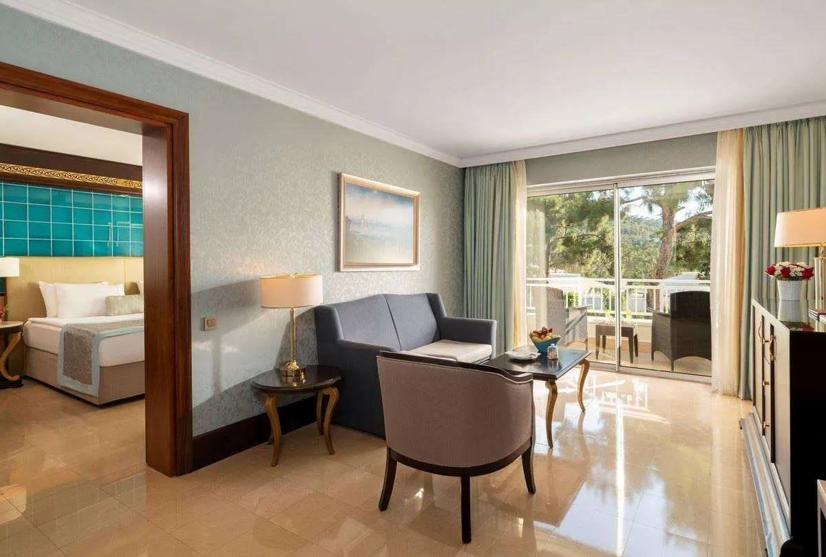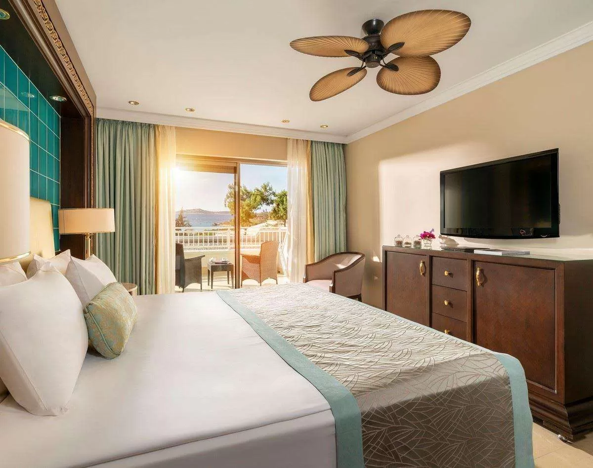 В отеле одно главное трехэтажное здание Main Building, 13 двухэтажных вилл Villas и 42 трехэтажных коттеджа Bungalow. Main Building: 39 deluxe room (из них 4 номера для инвалидов, макс. 3 чел., 42 м2),10 двухкомнатных suite room (гостиная, спальня с дверью, макс. 2+2 чел., 54 м2). Bungalow: 128 deluxe room (макс. 3 чел., 42 м2),1 двухкомнатный suite room (гостиная, спальня с дверью, макс. 2+2 чел., 54 м2), 98 однокомнатных premium room (макс. 2+2 чел., 52 м2), 40 двухкомнатных family suite (2 спальни с дверью, 2 ванные, макс. 4+1 чел., 72 м2), 24 трехкомнатных superior suite (гостиная, 2 спальни с дверью, 2 ванные, макс. 4+2 чел., 93 м2). Villas: 7 двухэтажных superior villa sea view (на 1 этаже: 4 спальни с дверью и с ванными, спутниковое TВ, балкон, сауна, шок-душ, большая гостиная с домашним кинотеатром, TВ плазменный, собственный бассейн; на 2 этаже: спальня с дверью, ванная с душем, терраса, гостиная с мини-кухней, домашний кинотеатр, TВ LCD, макс. 10 чел., 600 м2, Vip-сервис), 6 двухэтажных panorama villa (на 1 этаже: гостиная, кухня, спутниковое TВ, терраса, домашний кинотеатр, TВ плазменный, собственный бассейн; на 2 этаже: 4 спальни (из них 2 маленькие спальни с односпальными кроватями) с дверью и с ванными, балкон, домашний кинотеатр, TВ LCD, макс. 6 чел., 400 м2, Vip-сервис). В номере: Балкон или терраса, Электрический чайник; Набор для приготовления чая/кофе. Сейф бесплатно; Телевизор; Телефон; Кондиционер; Халат; Тапочки. Смена белья: 3 раза в неделю; Room service: бесплатно (02:00-06:00). Уборка номера: ежедневно.