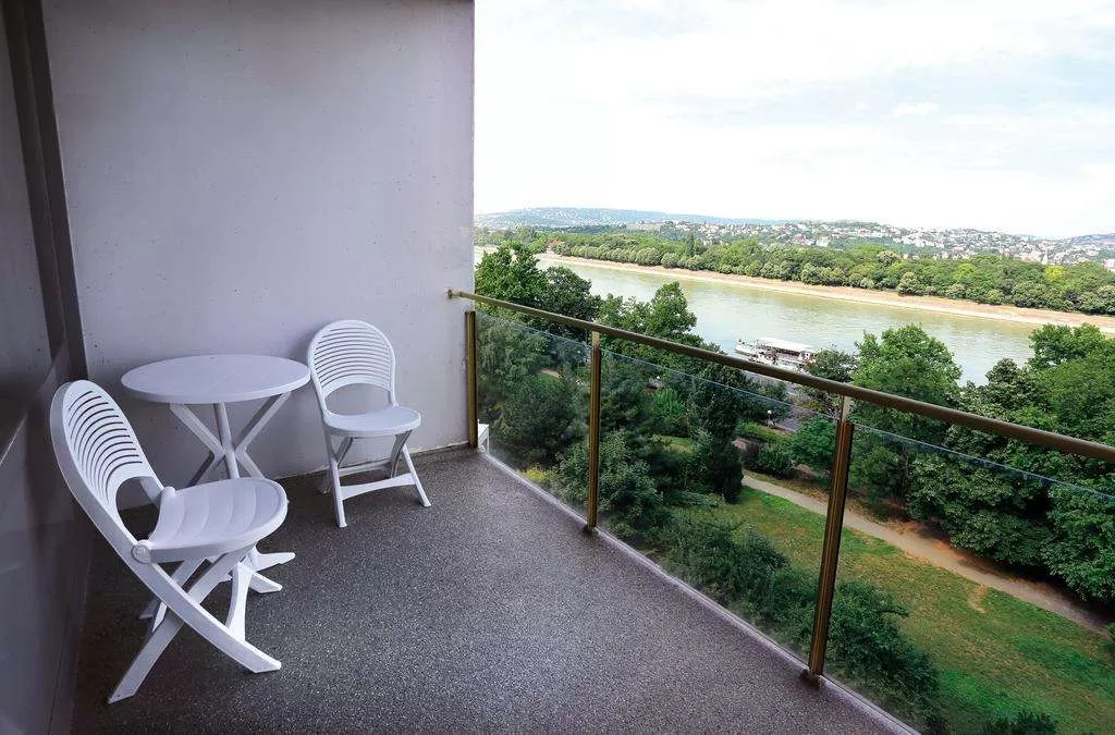 Двухместный номер Делюкс с балконом: Удобный и хорошо оборудованный номер с балконом, двуспальной кроватью или двумя односпальными кроватями, с видом на дунайскую сторону города, остров Маргит и холмы Буды. Оборудование номеров: кондиционер, окна со звукоизоляцией, ванная комната с ванной, фен, банный халат, сейф, мини-бар, кофеварка/чайник, телевизор с кабельными -, платными - и радиоканалами, а также с функцией будильника, услуга будильник, обслуживание в номерах, телефон, Бесплатная WiFi.