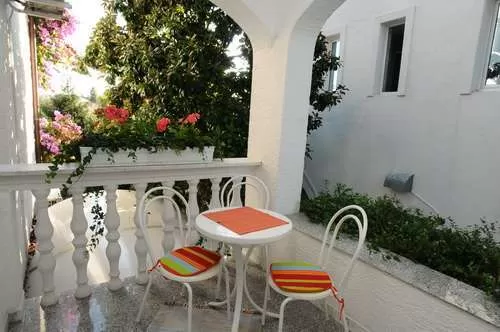 APART STD: около 110м2 + терраса 20м2, две спальни с французскими кроватями, гостиная с угловом диваном, большой обеденный стол, выход на большую террасу с видом в сад, отдельная большая кухня, выход на маленькую террасу с видом в сад, стиральная и посудомоечная машина.