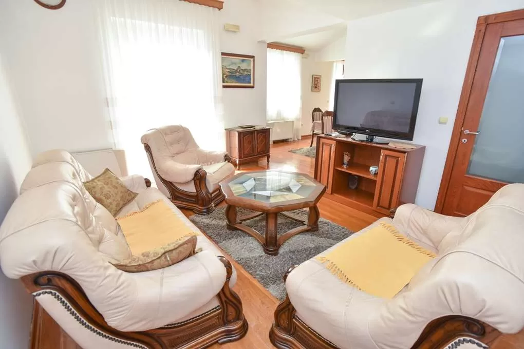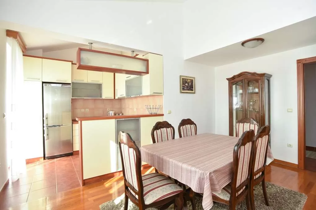 APP Large №13: около 100м2 + две террасы 20м2 с частичным видом на море и 15м2 с видом на гору; Большая кухня с посудомоечной машиной; Гостиная (два кресла и раскладной диван); Две спальни: в одной – французская кровать, в другой – две односпальные кровати. Две ванных комнаты – одна с душевой кабиной, другая с ванной, стиральной машиной. Полы – паркет.