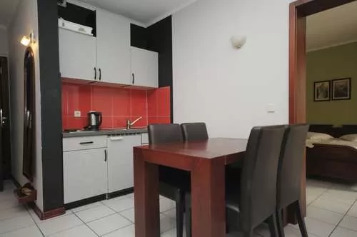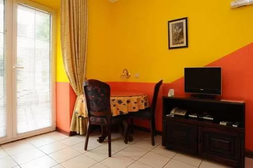 B3 APART STD: 37,40м2 + терраса 6,80м2 с видом на сад и дом по соседству, французская кровать в спальне и гостиная с кухней, две кровати в гостиной, обеденный стол.