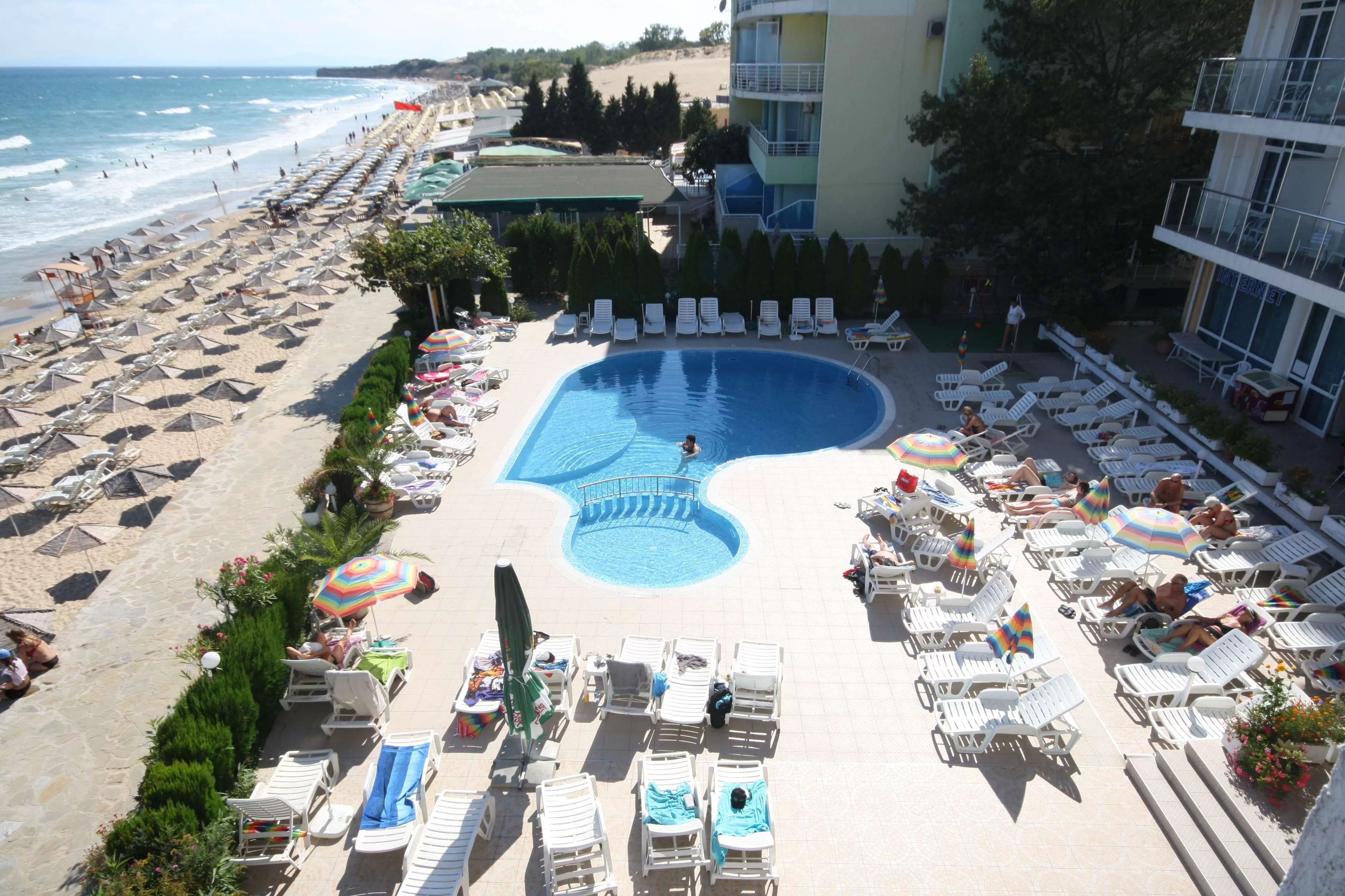 Общественный песчаный; зонты, шезлонги – платно. У бассейна: зонты, шезлонги – бесплатно.