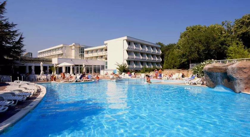 Отель расположен в 900 метрах от пляжной полосы, в тихой и зеленой парковой части курорта. Расстояние от отеля до: пляжа – 900 м; аквапарка «Аквамания»- 500 м; торговой улицы – 500м; минигольф площадок - 250 м; автовокзала – 1000 м; аэропорта в городе Варна - 40 км; Балчика – 10 км.