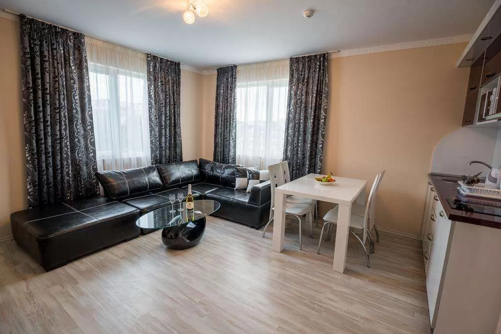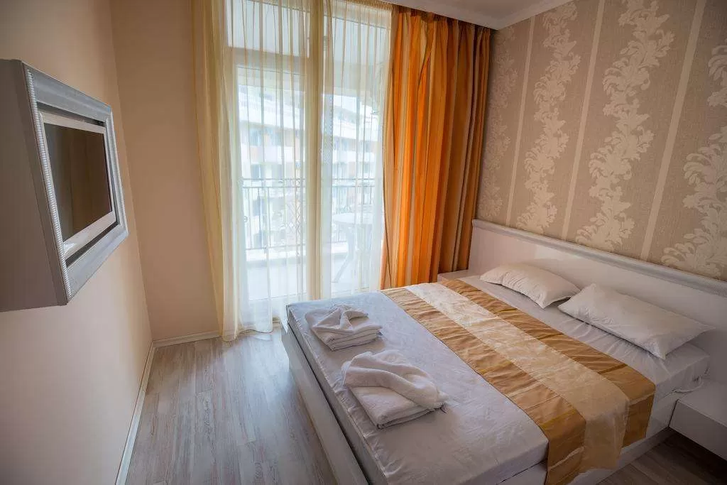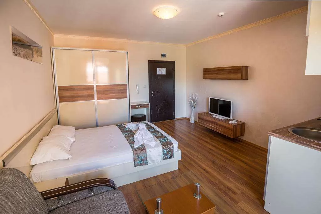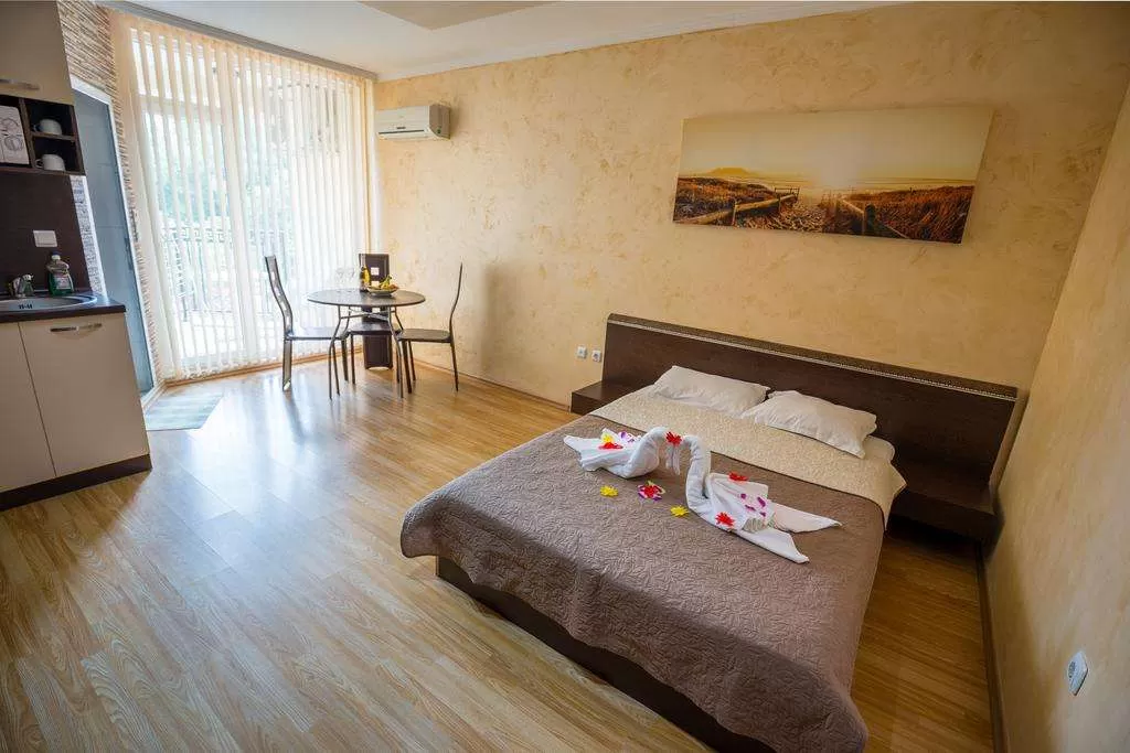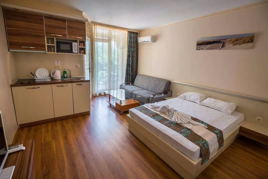Кондиционер • TV • Интернет /€/• Кухонный уголок •Балкон или терраса/стол + 2 стула/• Дополнительная кровать • Уборка – каждый день • смена полотенец – каждые три дня • постельное белье – каждые три дня • На полу – ламинат.