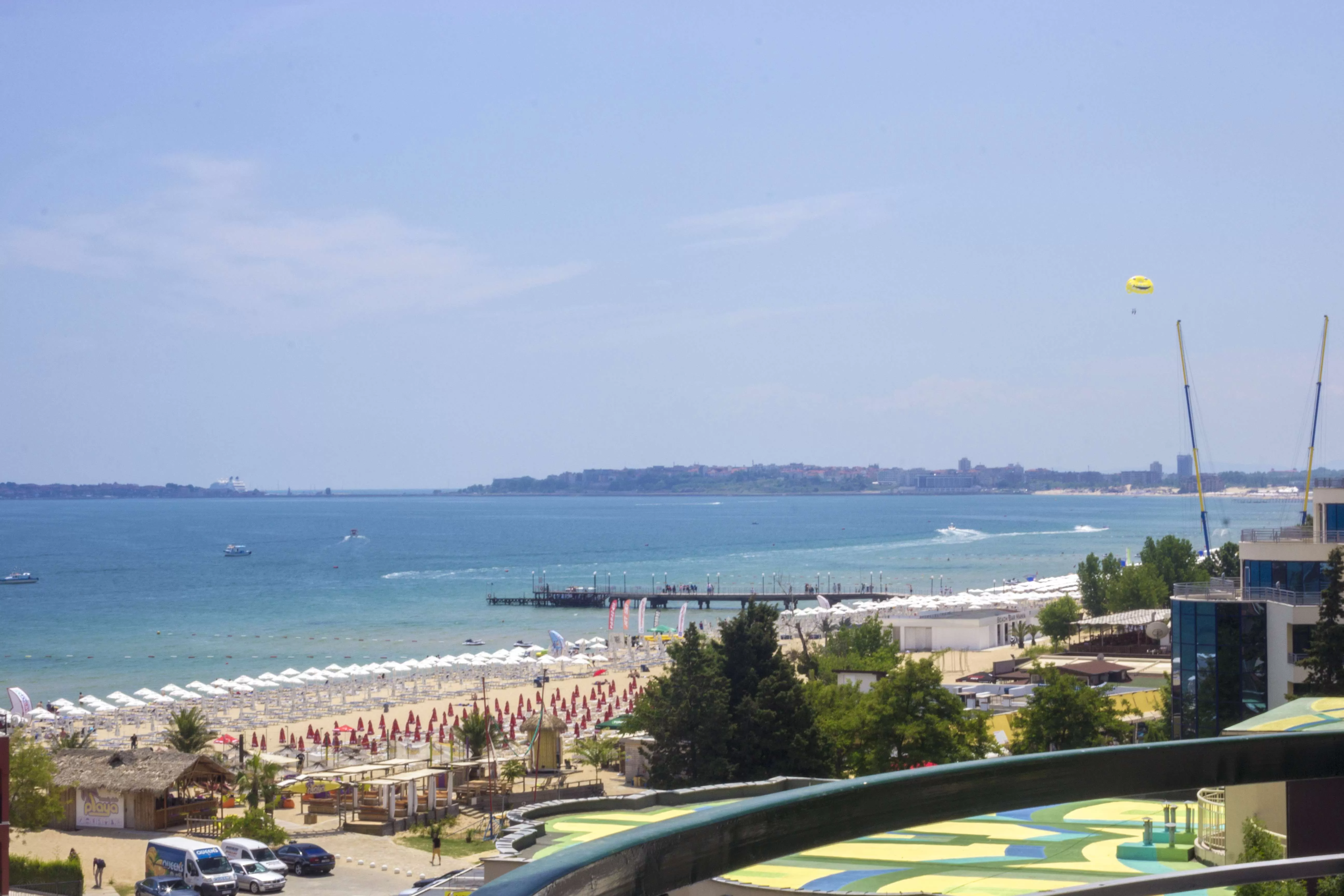 Общественный песчаный; зонты, шезлонги – платно. У бассейна: зонты, шезлонги – бесплатно.