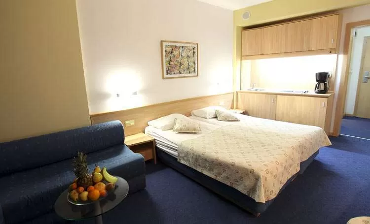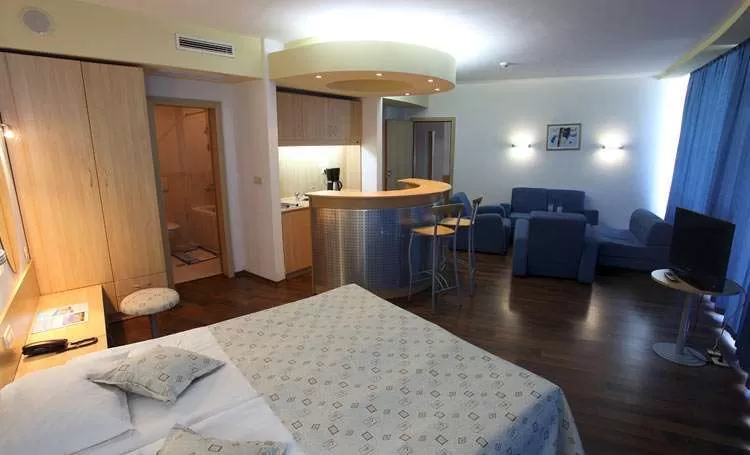Доп. кровать (диван-кровать) • центральный кондиционер • спутниковое TV • полностью оборудованный кухонный бокс (без духовки) • мини-бар • телефон • сейф (за доп. плату) • Wi-Fi (за доп. плату) • санузел с душевой кабиной • фен (ванной) • балкон • пол – ковровое покрытие • уборка номера – ежедневно • смена постельного белья – 2 раза в неделю • смена полотенец – ежедневно.