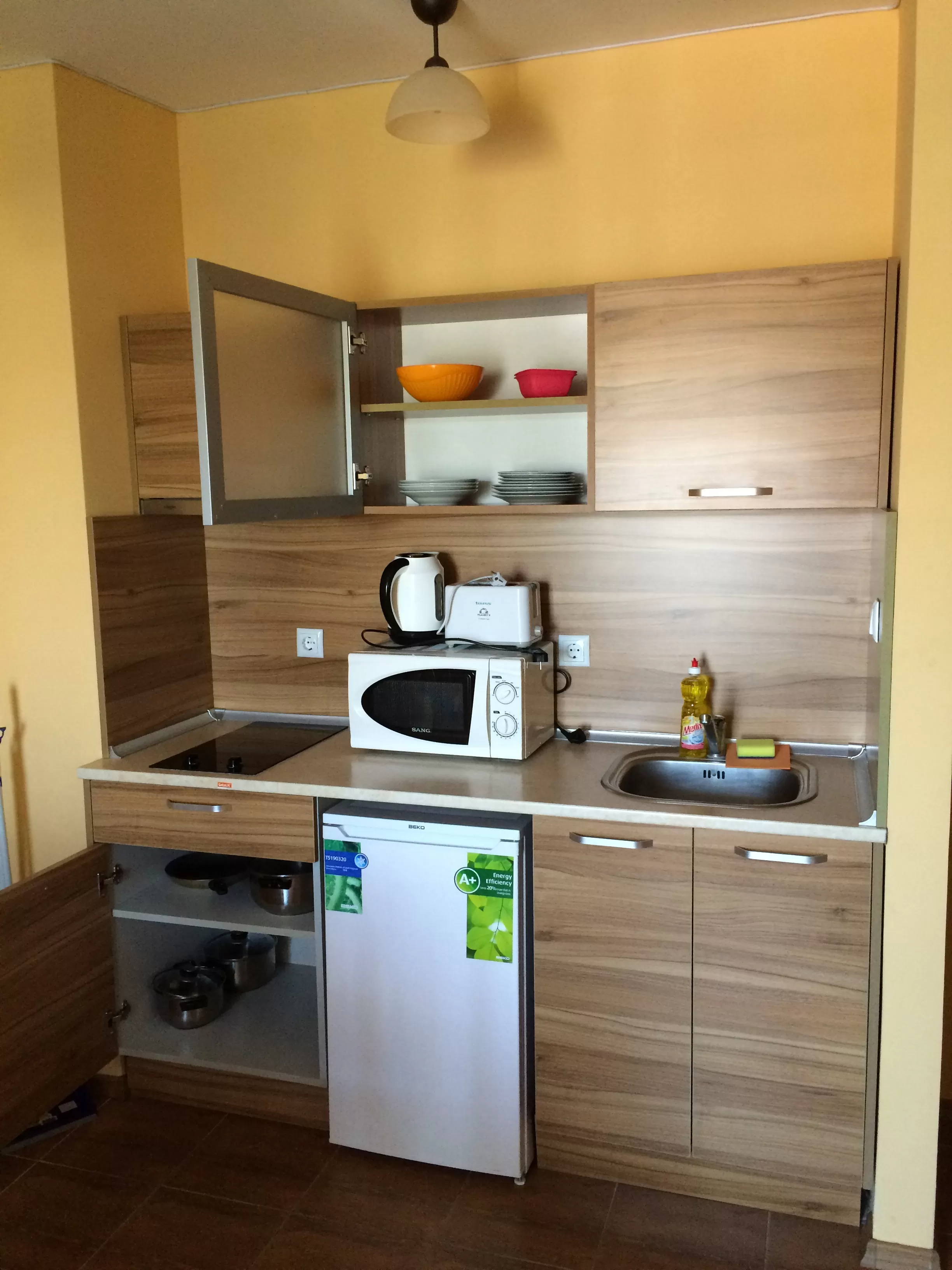 1 BR APARTMENT - STANDARD. Две комнаты. Спальня с кроватью 160 см или с двумя раздельными кроватями, в спальне гардероб, зеркало, тумбочки, межкомнатная дверь. Вторая комната – гостиная. Диван на два человека. Полноценная кухня с плитой, микроволновкой, холодильником, посудой, чайником. В комнате телевизор с плоским экраном, спутниковое телевидение (есть каналы на русском и украинском). Отдельный санузел с душем, феном. Min 2; max 3+1 или 4 взр.