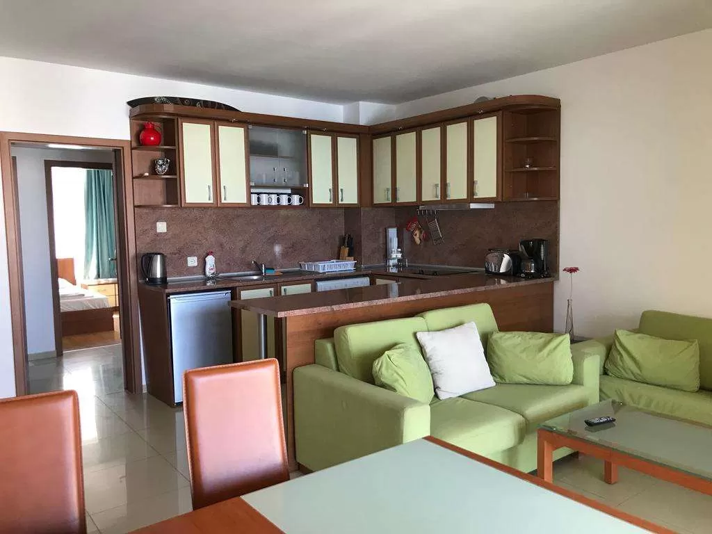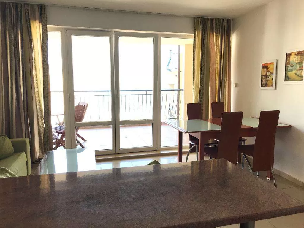 Балкон, кондиционер, телевизор, мини-кухня, холодильник, микроволновая печь, электрический чайник, кухонные принадлежности, ванна, фен, полотенца.