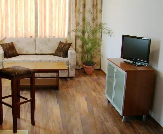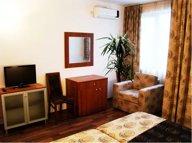 Кондиционер, TV, кухонный уголок – только в апартаментах, интернет (за доп. плату), балкон или терраса, дополнительная кровать – раскладное кресло или диван, возможность поставить двухместный раскладной диван, уборка – каждые три дня, смена полотенец – каждые три дня, постельное белье – каждые три дня, на полу - теракот.