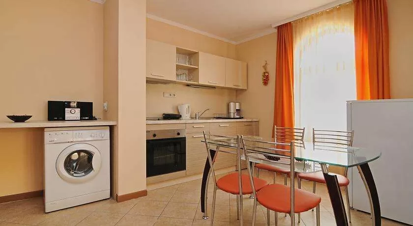 В номерах есть кондиционер, TV, телефон, холодильник, балкон или терраса. Дополнительная кровать – раскладной диван, кухонный уголок, уборка – каждый день, смена полотенец – каждые три дня, постельное белье – каждые три дня, на полу – плиты.
