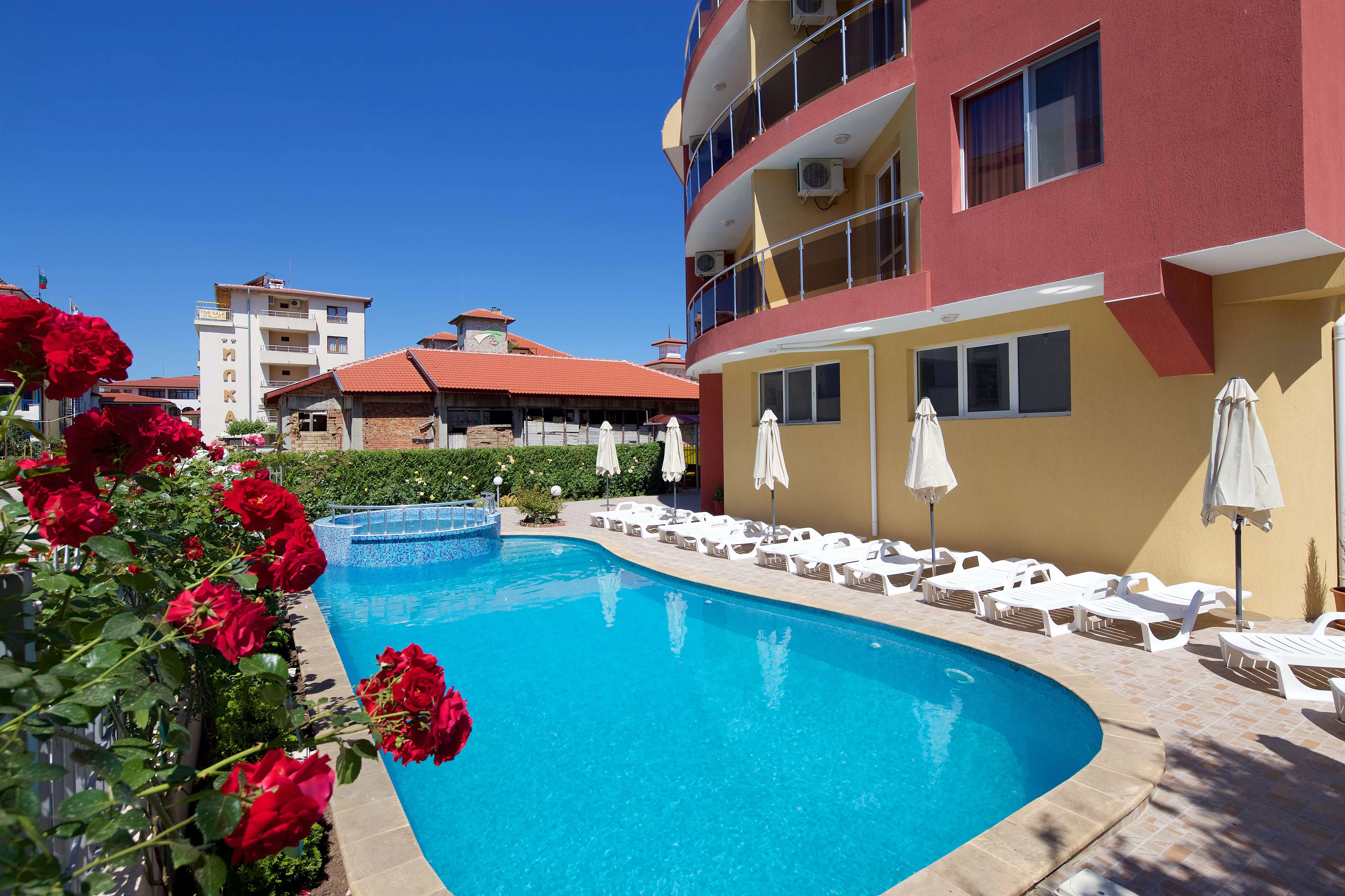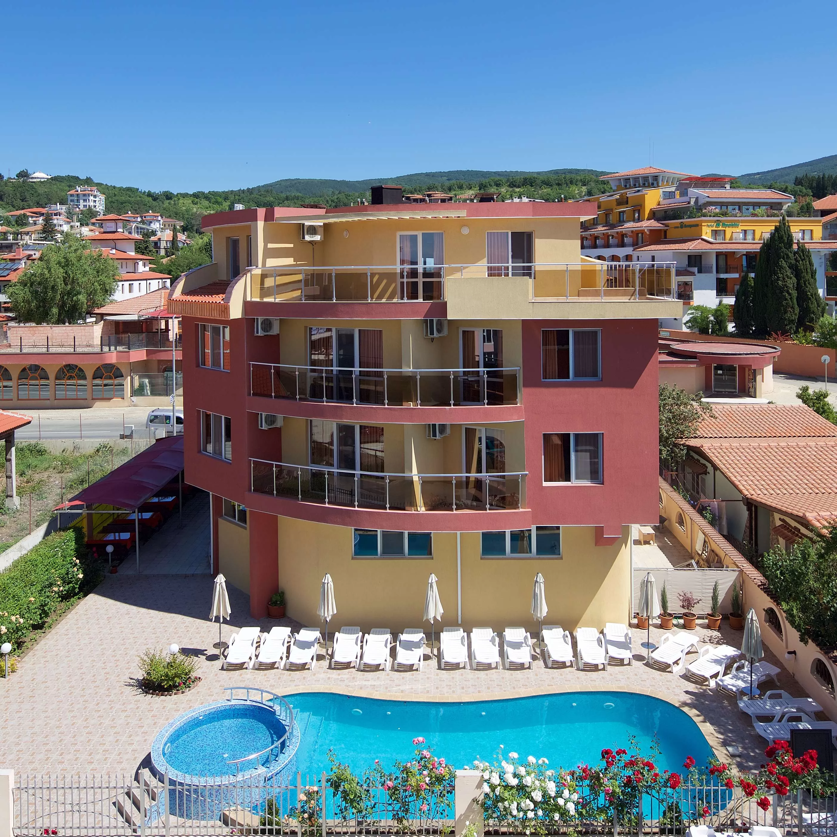 Отель расположен в 150 м. от остановки, в 30м от пляжа и в 2 км. от центра курорта. Рядом стоящие отели: Blue Bay, Carina Beach, Breza.