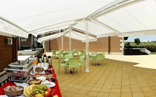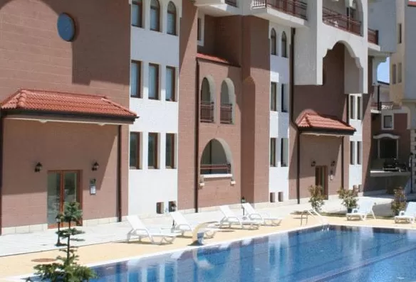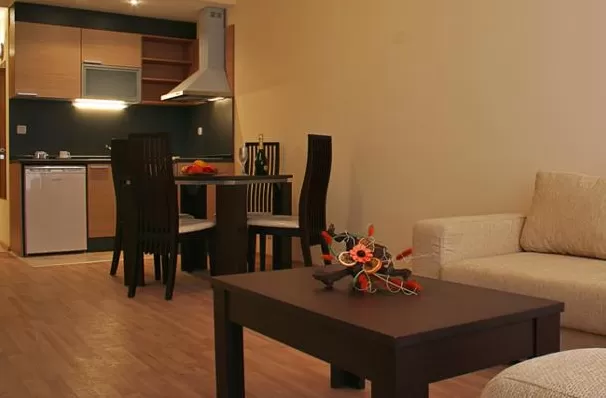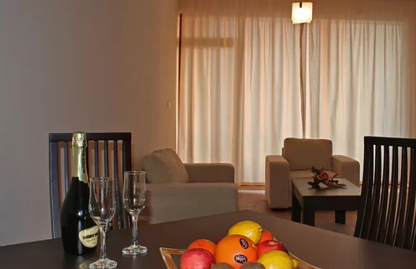 В апартаменте: гостиная с кухонным блокам и отдельной спальней ,с или без террасы в зависимости от расположения. В спальне: 2 тумбочки, небольшой письменный стол, табуретка, зеркало, гардероб.В гостиной: раскладной диван, низкий столик, кресло, высокий стол с 4 стульями, телевизор со спутниковыми программами, небольшая прихожая с вешалкой, обувной шкаф и зеркало. Кухонный блок: кухонный гарнитур, керамические панели, духовка, вытяжка, холодильник.Ванная: душевая-кабина, бойлер, зеркало.
