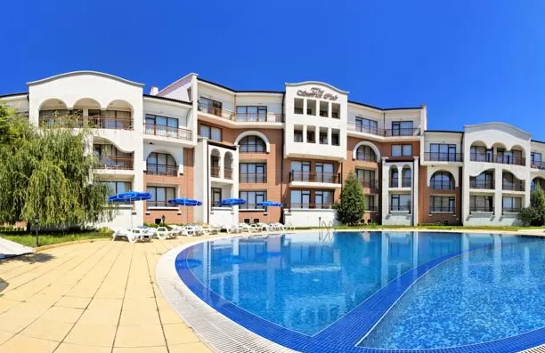 Общественный песчаный; зонты, шезлонги – платно. У бассейна: зонты, шезлонги – бесплатно.