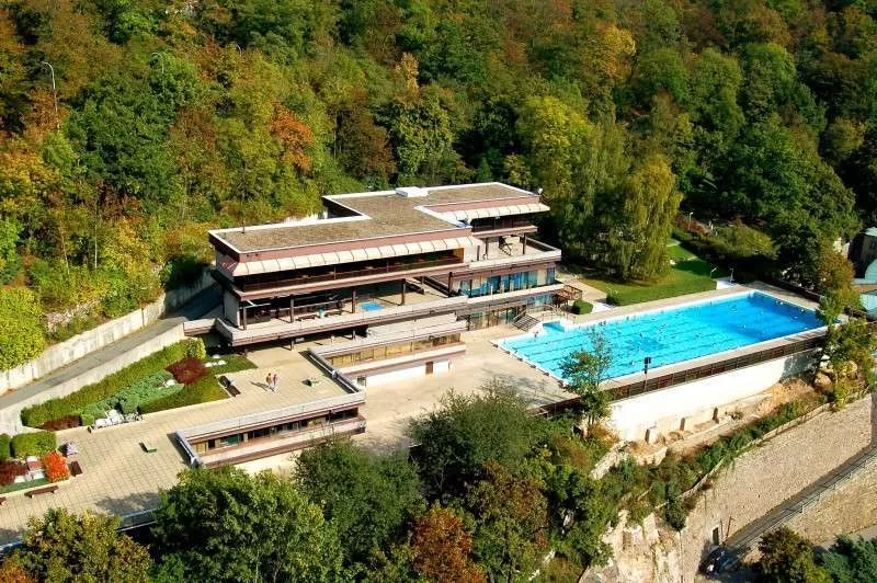 Бассейн и сауна: открытый бассейн (50х17м) - 30% минеральной воды и 70% обычной воды, с великолепным панорамным видом и террасой для солнечных ванн - с ноября 2014г. закрыт. C 01.04.2012г. открыт новый лечебный - wellness центр. Новинка - крытый бассейн размером 16х5,5 метров, который для гостей отеля бесплатно! Wellness центр предлагает бесплатно гостям – крытый бассейн, whirlpool, фитнес, дорожку Кнейпа. Работа лечебного - wellness центра: понедельник - пятница: 13:00 – 21:00, суббота: 10:00 – 21:00, воскресенье: 9:00 – 21:00. Сауна на 10 человек 6 евро/2часа с бассейном, тренажерный зал 4 евро/90 минут.