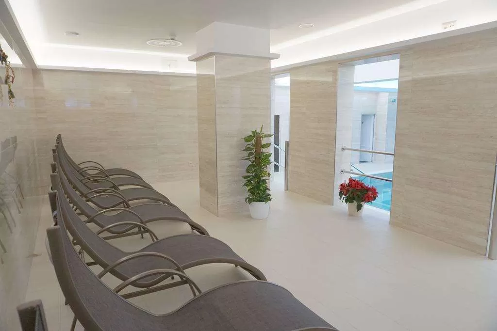 Бассейн и сауна: Закрытый (летом открытый) бассейн (12м х 6м) c подводными течениями,температура 32 °C - открыт с 15:00 до 20:00, кроме среды, бесплатно, джакузи на 6 чел бесплатно для проживающих в отеле. Сауна на 4 человека открыта ежедневно с 16:00 до 20:00 - 8евро/час.