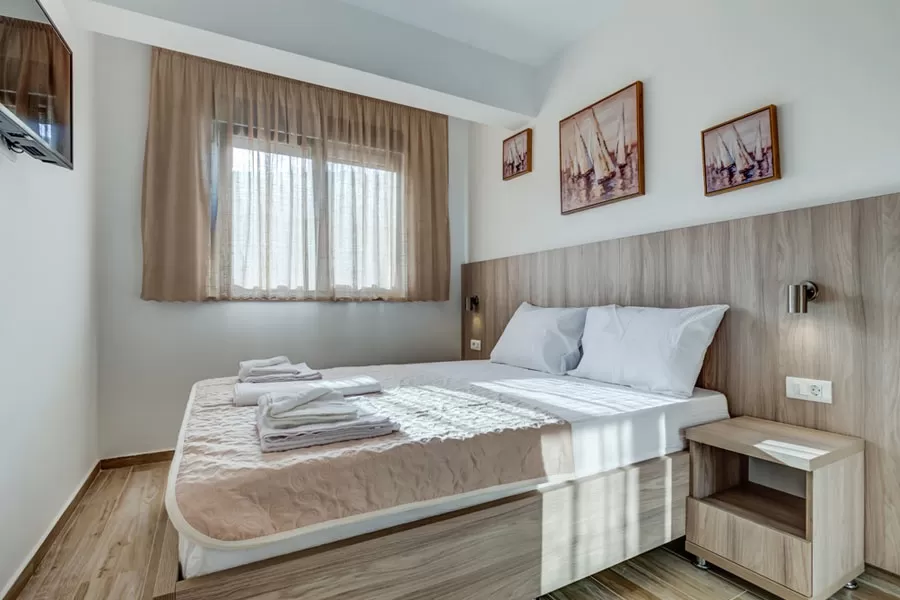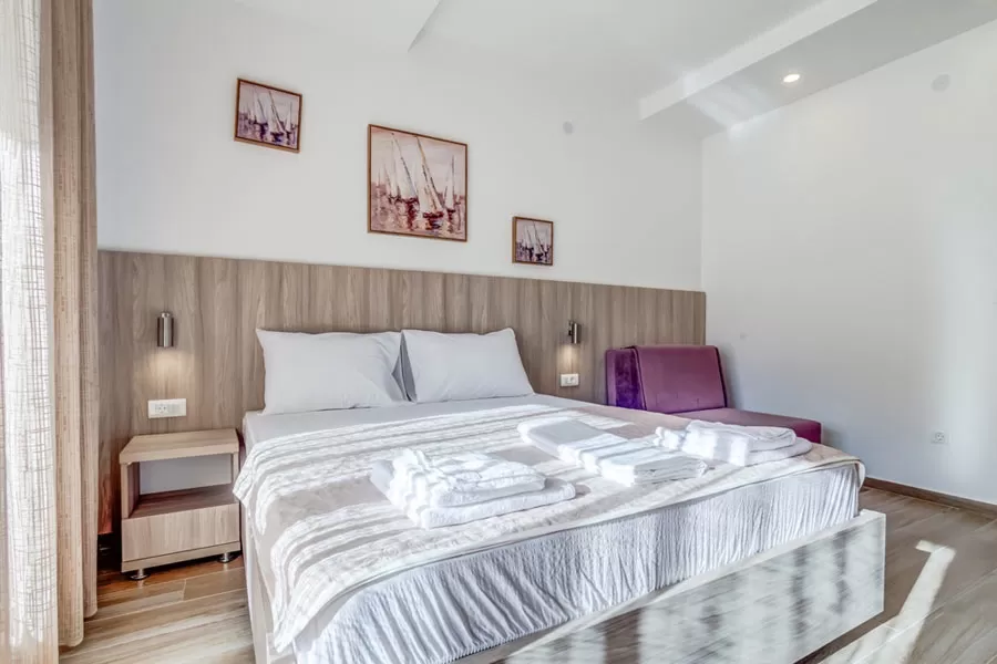 Studio 02+1: 26м2, терраса 6м2 с видом на море или горы, французская кровать + раскладное кресло, кухня. APP 03+1: 40м2, терраса 6м2 с видом на море или горы, спальня с французской кроватью, гостиная с двумя раздельными кроватями, кухня.