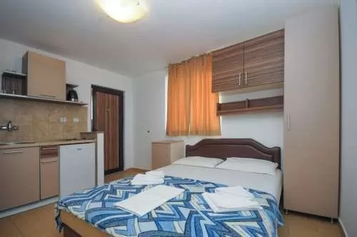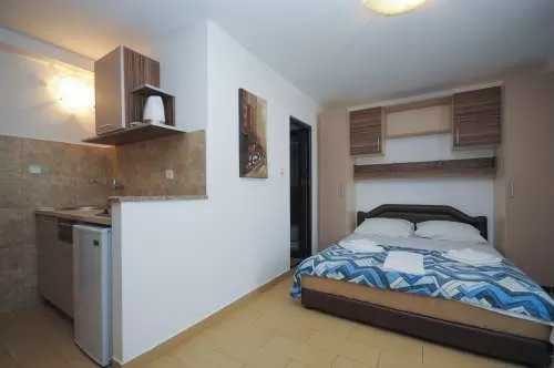 В апартаментах/студиях: мини-кухня, в которой можно готовить легкую пищу, электрический чайник, кондиционер , фен, плазма ТВ (8 русских каналов), душ, терраса со столом и стульями, пол – керамическая плитка .