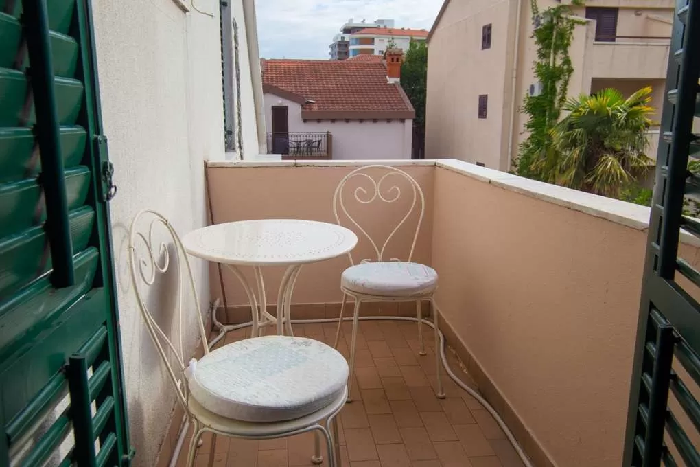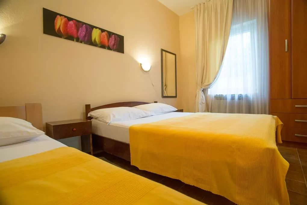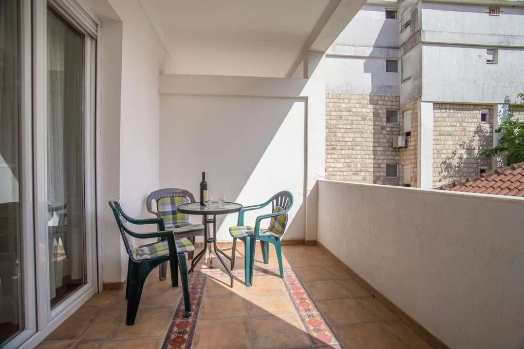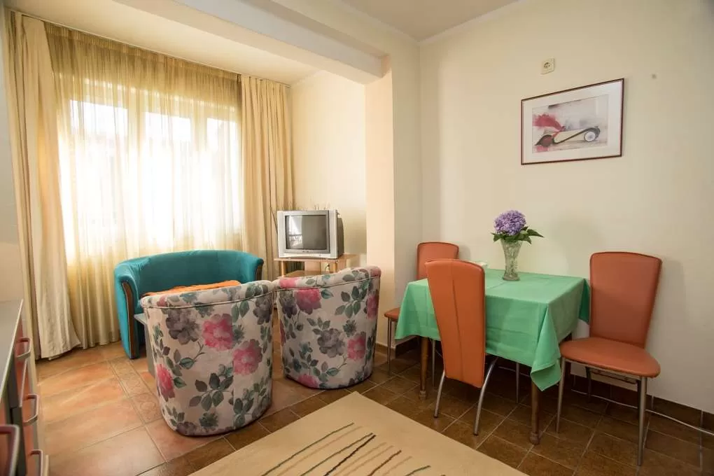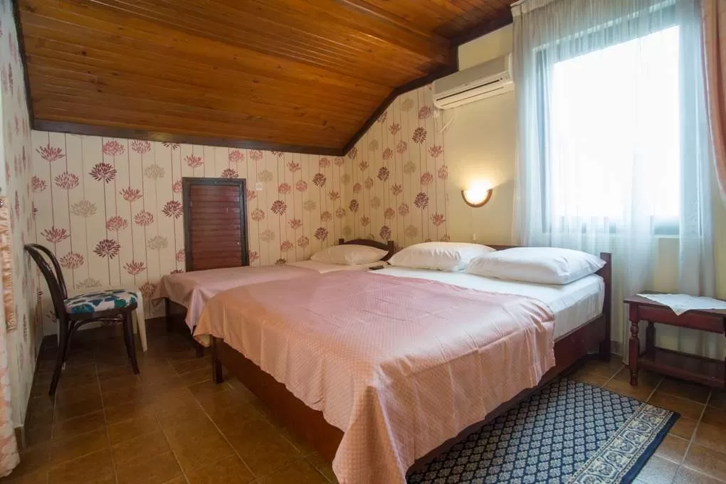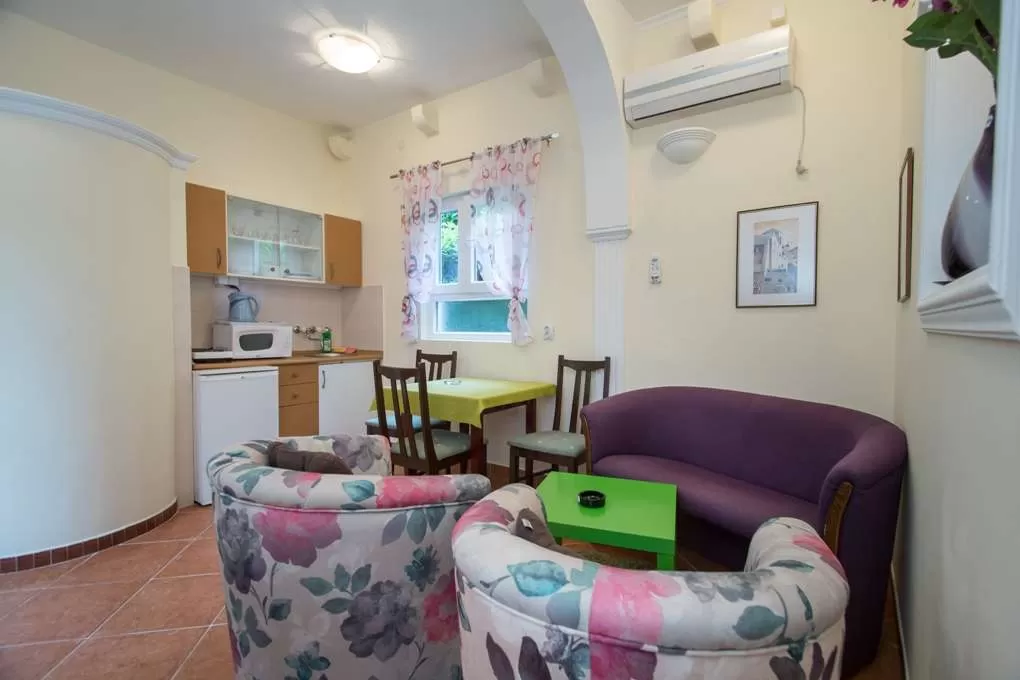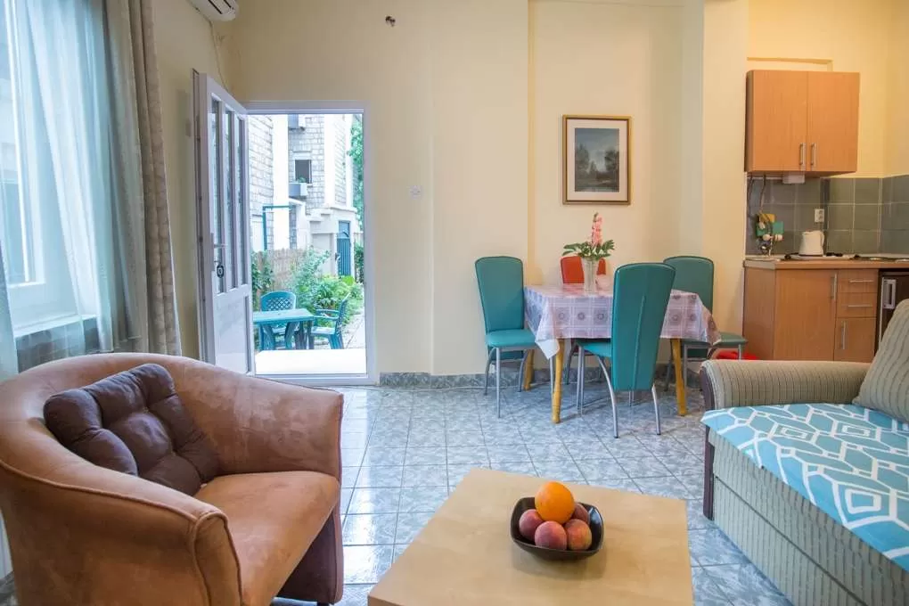 №3 APART First floor: 31м2, маленькая терраса и отдельный вход.  Гостиная с мини кухней. Спальня с французской кроватью + отдельная кровать. Ванная с занавеской.
