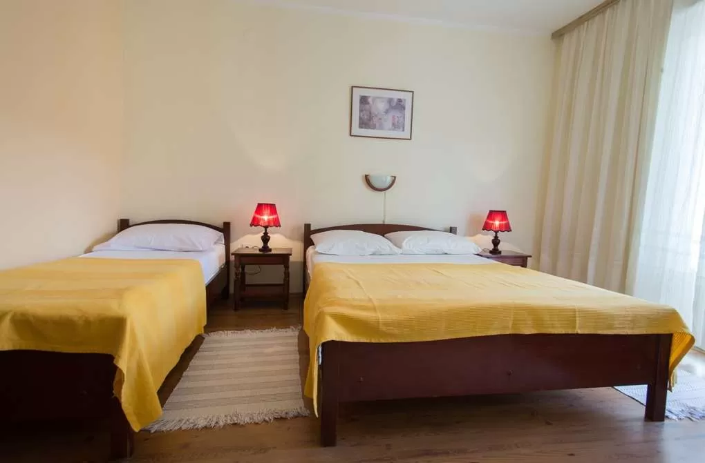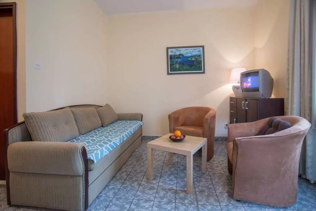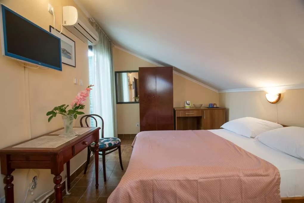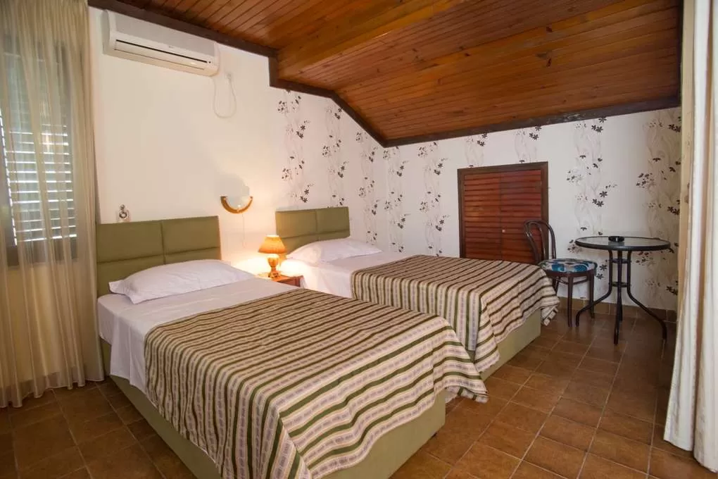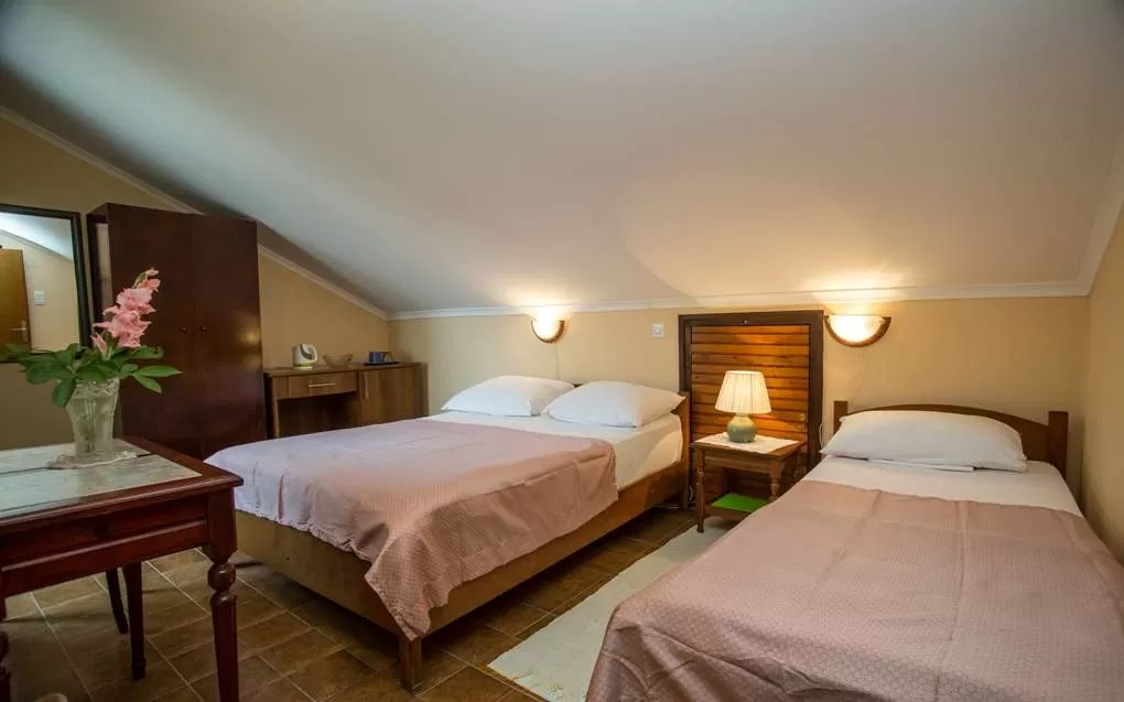 №2 APART STD: 33м2, терраса 6м2, гостиная и мини-кухня. Спальня с французской кроватью + отдельная кровать. Выход на террасу из обеих комнат. Ванная с занавеской.