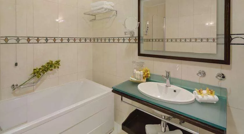 Ванная комната с душем и ванной, биде, феном, туалетными принадлежностями. Тапочки и халат, кондиционер, телефон, LCD телевизор, письменный стол, сейф, мини-бар, Wi-Fi. Кухонный уголок включает холодильник, микроволновую печь, посуду. Дополнительная кровать по запросу.