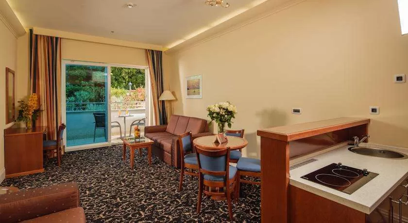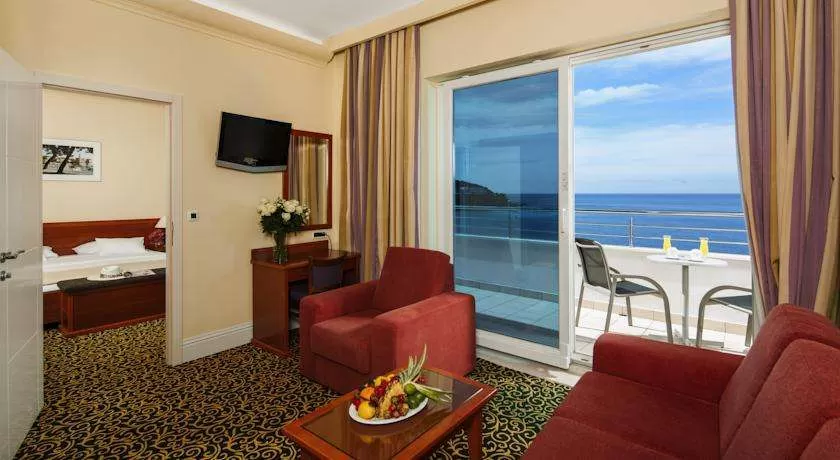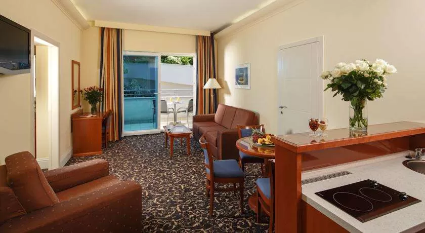 Luxury suite – сьют площадью 52 кв. м состоит из спальни с двуспальной кроватью или двумя кроватями twin, гостиной, столовой зоны, кухонного уголка, балкона с видом в сад или на море.