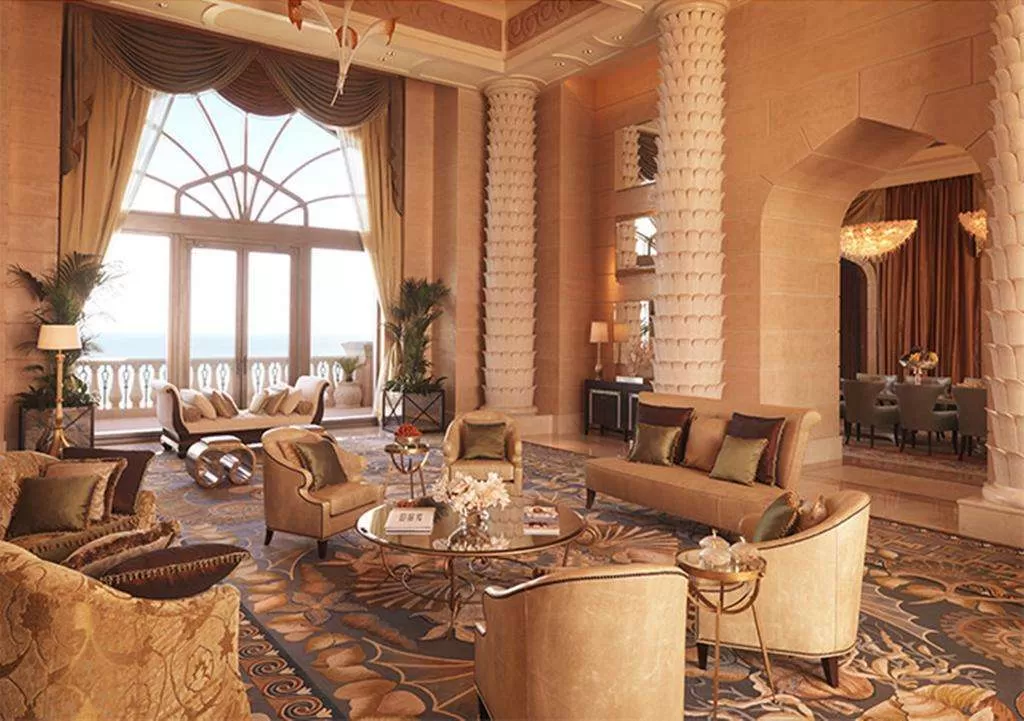 1 Royal Bridge Suite (924 м2, главная спальня с 2 ванными для мужчины и женщины, с гостиной и рабочим кабинетом, с выходом на балкон; 2-я спальня с 2 ванными для мужчины и женщины, с выходом на балкон; 3-я спальня с ванной; огромная гостиная со столовой зоной (обеденный стол на 16 чел.), с выходом на оба балкона, библиотека и медиа-центр, оборудованный по самым современным технологиям, полностью оборудованная кухня; огромные панорамные окна с видом на Персидский залив и остров Пальма; 2 кровати king-size (в главной и 2-й спальне) + 2 queen-size beds (в 3-й спальне); макс. 6 чел.; круглосуточно услуги 2-х дворецких, закрепленных за номером, личный повар; номер возвышается над аркой, соединяющей Королевские башни (Royal Towers), отдельный охраняемый вход; клубные привилегии).