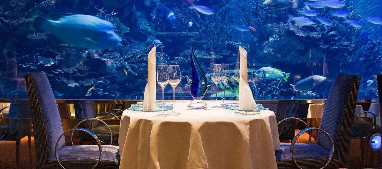 Ресторан Al Mahara - признанный одним из лучших ресторанов мира, Al Mahara предлагает отведать изысканные морепродукты в окружении диковинных обитателей морской пучины. Перед тем как попасть в ресторан, гости отправляются в трехминутное путешествие в симуляторе подводной лодки.