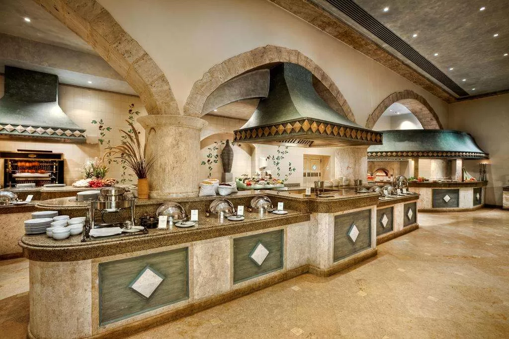 HB - главный ресторан: завтрак, ужин, все напитки за дополнительную плату. FB - главный ресторан: завтрак и ужин (шведский стол), обед в ресторане Аля Карт Al Mar (по меню). Все напитки за дополнительную плату. The View Restaurant – главный ресторан (a la carte & buffet) интернациональной кухни: завтрак (07:00-11:00), ужин (18:00-22:00), Al Mar Restaurant & Bar – a la carte ресторан интернациональной кухни: обед (12:00-16:00), Bamboo Shoot Restaurant – a la carte ресторан азиатской кухни: ужин (пн, сб, вс 18:30-22:00), La Pergola Restaurant – a la carte ресторан средиземноморской кухни: ужин (вт, ср 18:30-22:00), Laguna Club Lounge: завтрак (07:00-11:00), обед (13:00-15:00), легкий ужин (18:30-20:00). Бары: Sultan Lounge Bar (14:00-00:00), Beach Comber Bar (10:00-17:00; закуски 12:00-16:00), El Diwan Shisha Corner (кальян).Отель, на свое усмотрение, может изменить время работы, место подачи и концепцию предоставляемых услуг в ресторанах и барах.