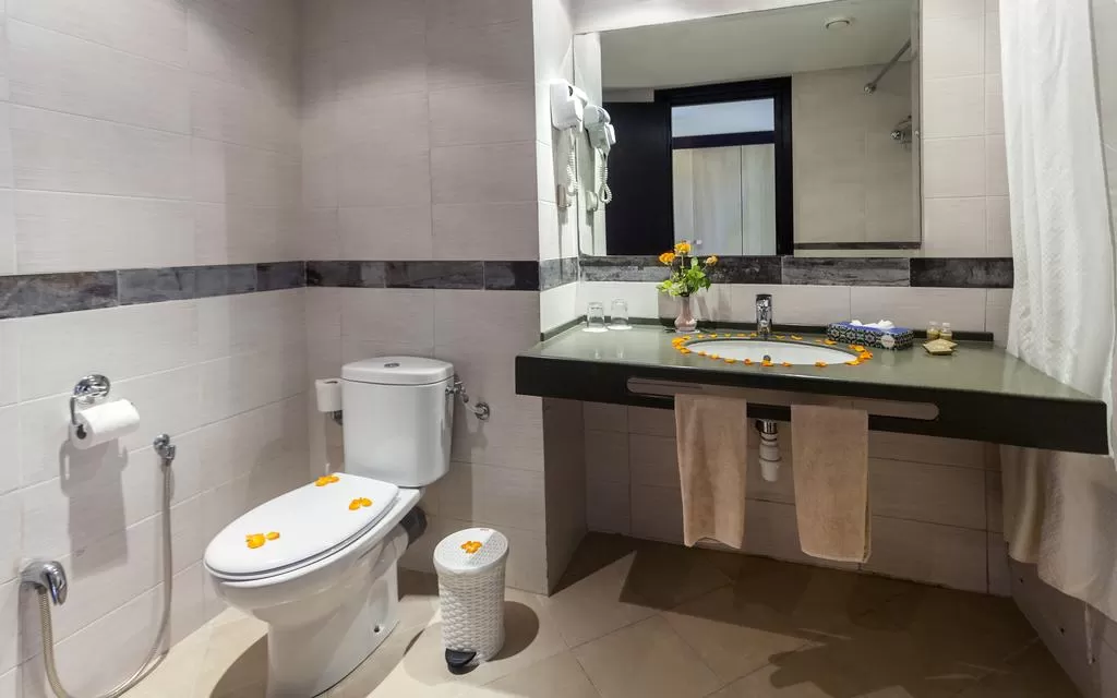 В номере: кондиционер, телевизор, телефон, холодильник, сейф, душ, фен.