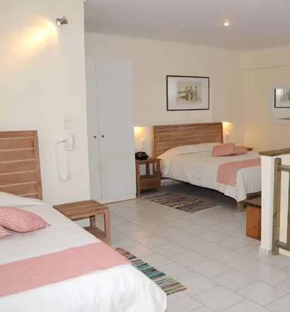 Duplex min 4 pax Стиль мезонеты. На первом этаже – 2 односпальных кровати и ванная комната; на втором этаже (нет двери) – двуспальная кровать, односпальная кровать и диван, ванная комната.